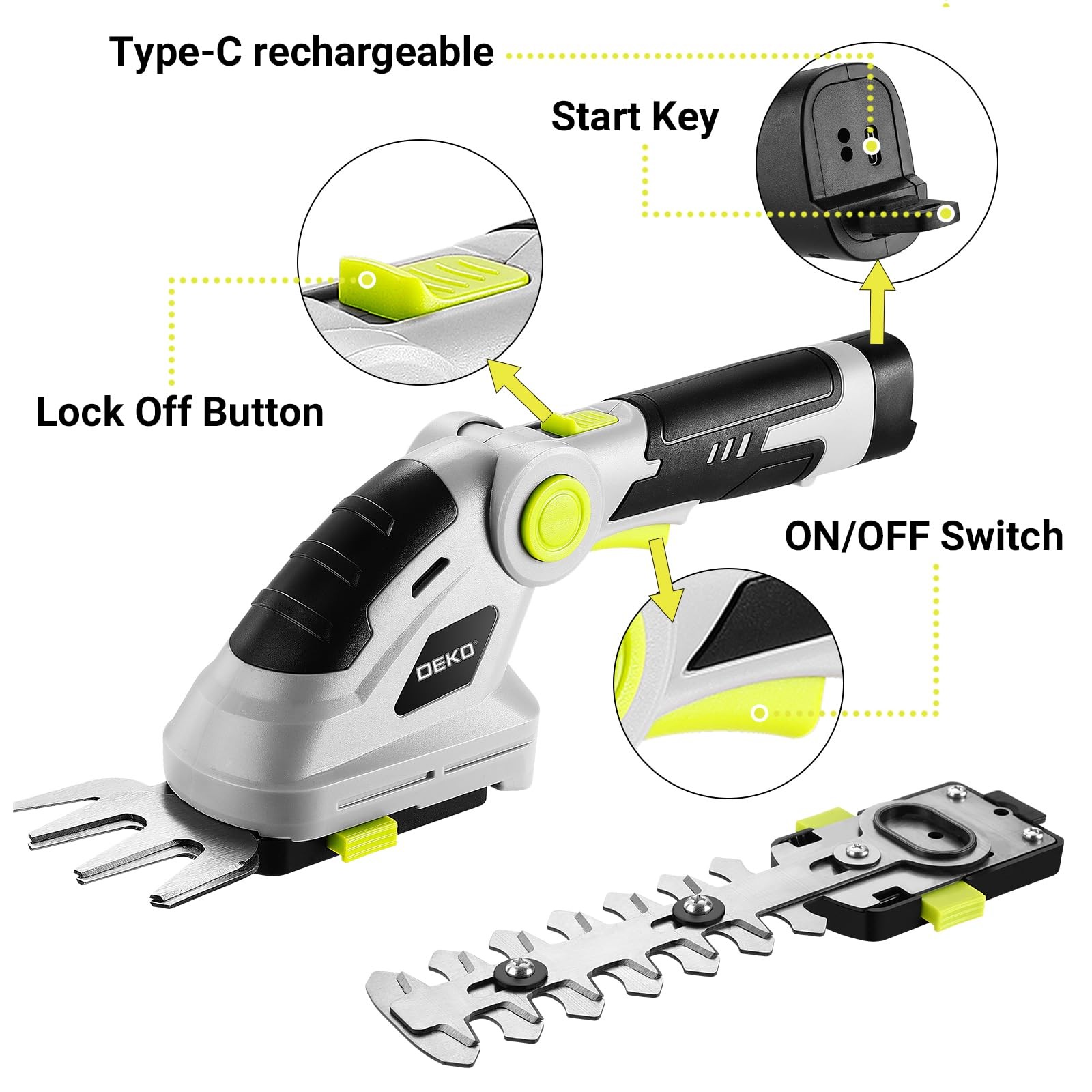 cordless hedge trimmer has an angle adjustment range from +45° to -60°, ideal for trimming grass or shrubs of all heights. It's easy to adjust the angle by pressing and holding the rotary button then swing the handle upwards and downwards to adjust the angle. The variable angle of our electric grass trimmer makes the garden and lawn care much comfortable 【Variable Angle Operation】The cordless hedge trimmer features an angle adjustment range from +45° to -60°, making it suitable for trimming lawns and shrubs of varying heights. Simply press the rotation button and swing the handle to adjust the angle. The 2-in-1 design allows for quick switching between lawn and hedge trimming modes, which is easy for beginners to use 【Multiple Safety Protections】The electric hedge trimmer includes a start key at the bottom of the handle to prevent accidental startup. To start, insert the key, press the lock button, and simultaneously press the switch button to ensure safe operation 【Lightweight and Portable】Weighing only 1.5 pounds, the handheld hedge trimmer is equipped with an ergonomic handle for flexible use without causing fatigue during extended periods of operation. It also features a high-capacity 2000mAh battery for longer runtime 【Sharp Blades】 The trimmer is fitted with sharp and durable blades, ideal for trimming lawns, hedges, and small shrubs. The blades measure 5.79 inches in length and 3.26 in inches width, delivering excellent trimming results 【Warm Tips】The trimmer comes with a Type-C charging cable. For optimal battery performance, it is recommended to charge the device every 3-6 months, even if not frequently used. Clean the blades promptly after each use and store them in a dry place to extend their lifespan