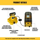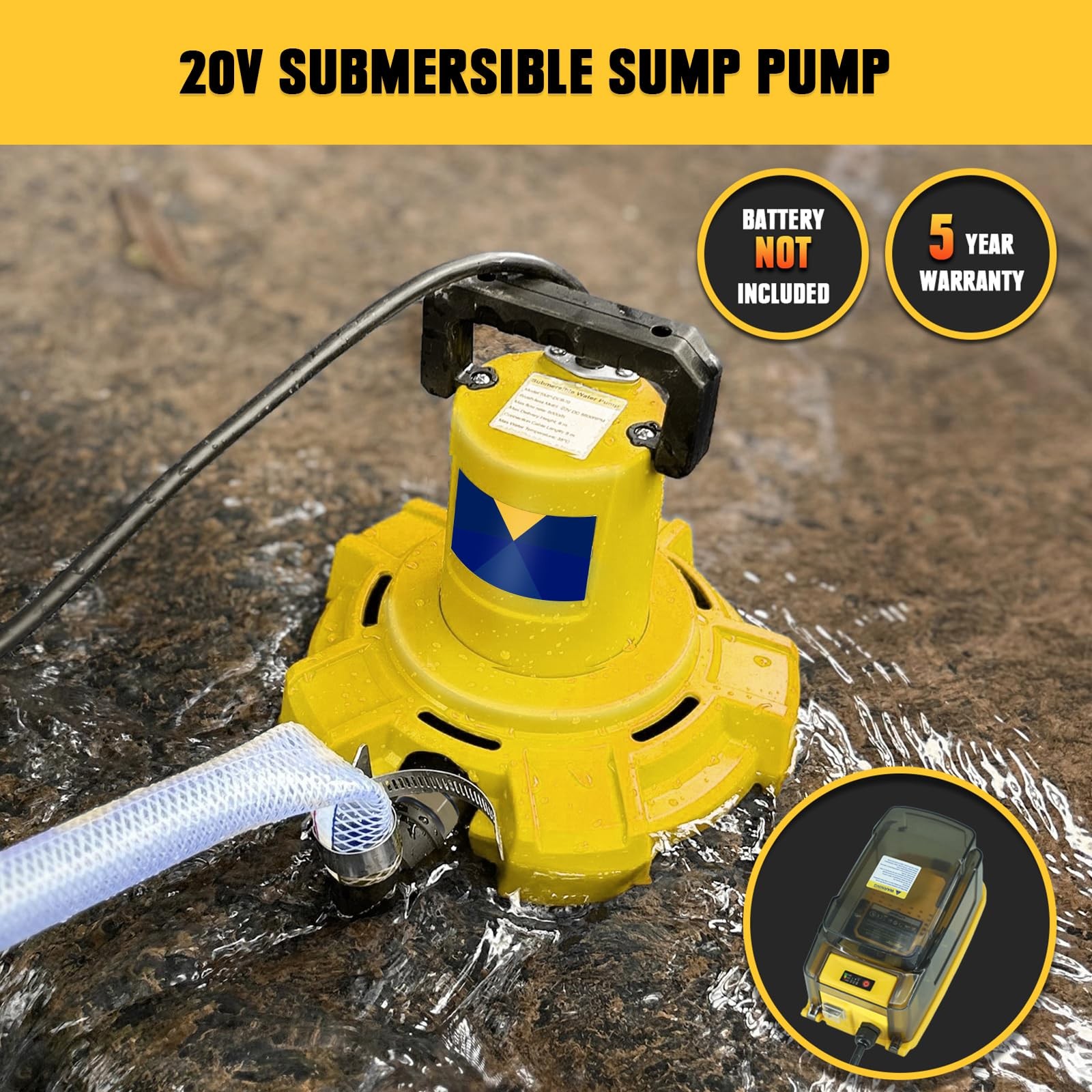Introducing cordless submersible water pump, is compatible with Dewalt 20V batteries (Battery NOT Included). With a powerful brushless motor, the portable utility pump achieves an impressive max flow rate of 1320 GPH, capable of lifting water up to 26 feet. You can customize the flow rate to your preferences with 3 modes: L(792 GPH), M (1056 GPH), and H(1320 GPH). This submersible pump features automatic water detection, ensuring to auto stop after a 10-second delay when no water is detected, adding convenience and efficiency. The 3/4" outlet easily connects to standard garden hoses, and the integrated strainer effectively filters debris, promoting a cleaner water output. Upgrade your water transfer tools today for various applications, including pool maintenance, flooded basements, garden pond maintenance, and other draining tasks. Cordless Submersible Water Pump: This submersible transfer pump is compatible with Dewalt 20V battery (Battery NOT Included). We focus on providing reliable tools for users who may already own compatible batteries and chargers Up to 1320 GPH Flow Rate: Equipped with a powerful brushless motor, this electric water transfer pump achieves a max flow rate of 1320 GPH and has a maximum lift capacity of 26 FT, easily tackling any draining job 3-Mode Flow Settings: You have the flexibility to pick from 3tailored flow settings to perfectly match your preferences: Low (792 GPH), Medium (1056 GPH), and High (1320 GPH) Auto Water Detection& Shutdown: Built-in water source detection feature, the portable utility pump auto stop after a 10s delay when no water is detected, ensuring convenience and efficiency 3/4" Outlet & Integrated Strainer: The 3/4" outlet easily connects to standard garden hoses, ensuring convenience for your water pumping needs. And the integrated strainer effectively filters debris, minimizing clogging and protecting the pump from damage Wide Application: This submersible pump features a 15.4FT extension cord, makes easy to transfer water from farther position. Suitable for swimming pools, basements, garden ponds, and other flooding areas