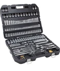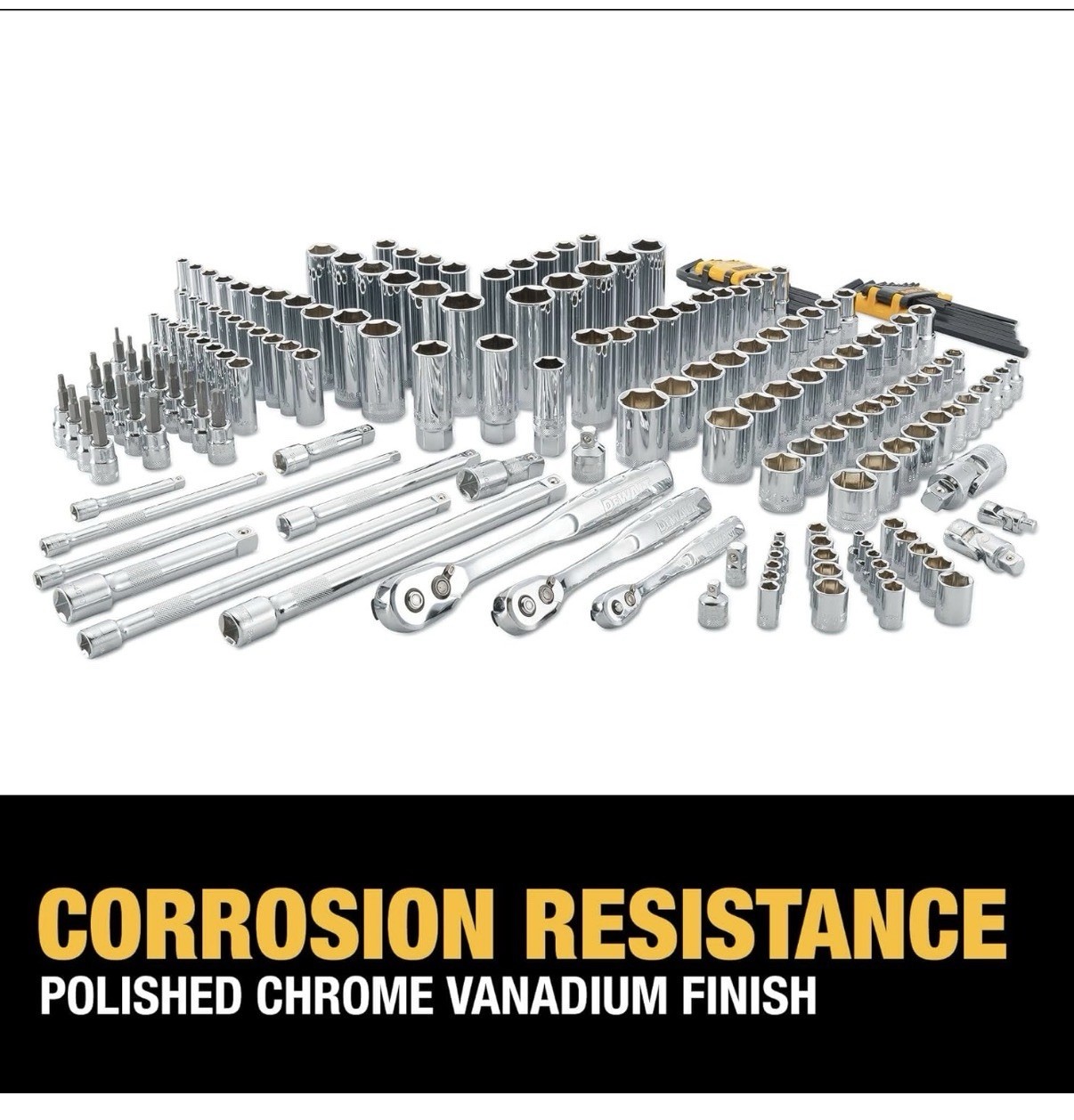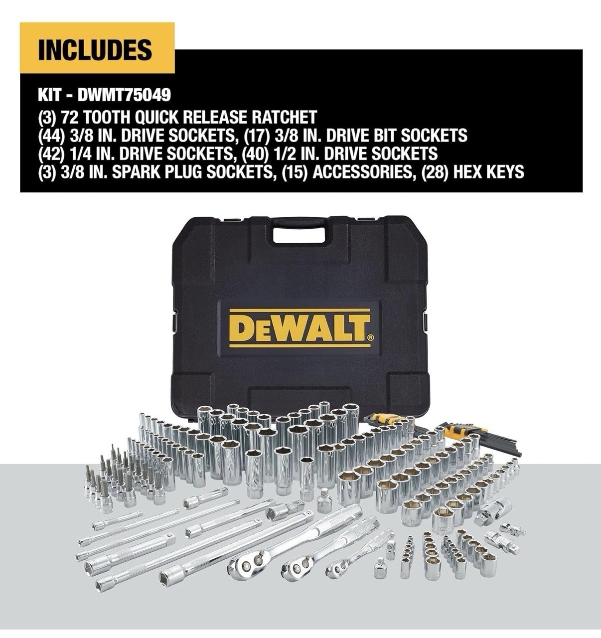 Comprehensive Assortment: Includes 192 pieces—covering 1/4", 3/8 ratchet, and 1/2" drive ratchets, 1/4 socket set, 1/2 socket sets (SAE & metric), combination wrenches, extensions, adapters, hex keys, ratchet set metric wrench set, metric socket set, deep socket seta and accessories Ideal for mechanics, automotive, as a car tool kit and general maintenance tasks High-Quality Construction: Made from durable chrome vanadium steel for long life, corrosion resistance, and reliable heavy-duty performance. Mirror-polished chrome vanadium finish not only resists corrosion but also offers a professional look DirectTorque Technology: Sockets feature DirectTorque technology, which helps prevent rounding of fasteners and ensures optimal torque transfer 6-Point Socket Design: Provides better grip and reduces the risk of fastener rounding, especially compared to traditional 12-point sockets Easy Identification: All tools and sockets are clearly hand-stamped for quick and easy size identification in the field or shop Convenient Storage Case: Supplied in a durable hard shell carrying case, making organization, transportation, and protection of the tools straightforward and reliable Lifetime Warranty: Supported by DEWALT’s lifetime warranty, which delivers confidence and long-term value Versatility: Suited for professionals, serious DIYers, and mechanics for automotive work, machinery repair, and household projects Knurled Control Ring