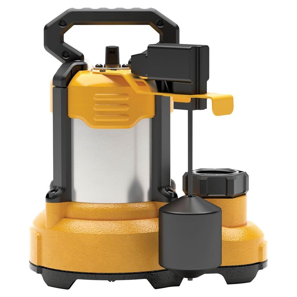 The DeWALT DXWP62383 is a new automatic submersible sump pump made of stainless steel and cast iron. It has a 1/3 horsepower motor and can pump water at a maximum flow rate of 75 GPM .