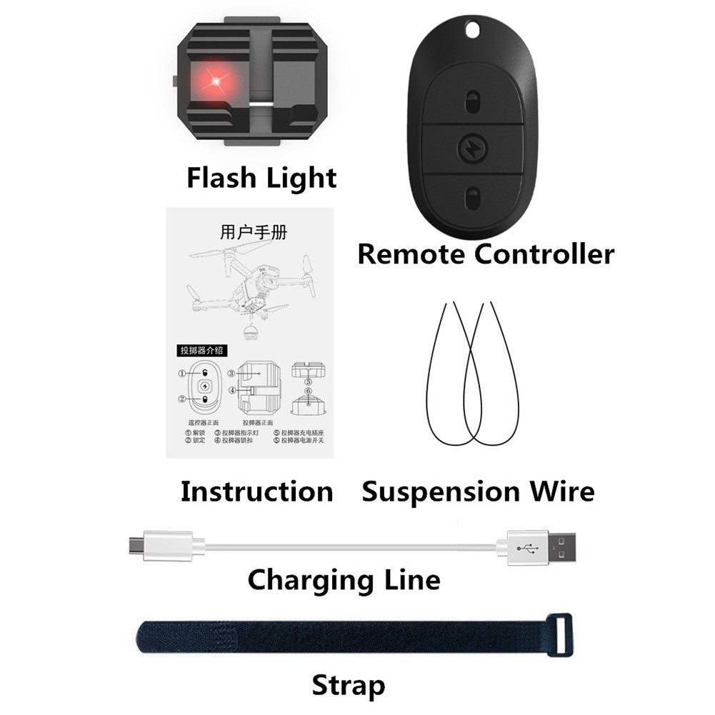 Drone Airdrop System for 4 Pro/ 3 Pro/ SE/ 2/2 SE for Fishing Bait6542 Widely Compatible: The drone dropping device suitable for most drones like for Mini 3 Pro, Mini 3/ Mini/Mini 2/Mini SE/Mini 2 SE/ Air 2/Air 2S/ 3/Classic/Cine/Spark/ 2 Pro/Zoom/MavicPro/Avata/Fpv/ X8SE/Phantom 3/4 Pro/Holystone HS720/720E/720G/HS440/ F11S drone,etc. It is almost suitable for drones with a load weight of over 100g. Product Parameter: Maximum Load: 750g, Built-in Battery Capacity: 350mAh, Standby Time: about 12 hours, Self-Charging Time: 1.5 hours, Turn On or Off Times(full charge once) Easy to Control: One-button operation through the 2.4G remote controller. The remote control distance is 150m. Quick to Assemble: Nylon Sticker installation not damage the drone body. Simply thread a Nylon Sticker strap into the adjuster hole, adjust it to a suitable position according to the size of your drone, and fix it (the strap avoids the drone bottom sensor). Hang the matching sling onto the thrower lock to load the item (hang it according to the weight of the drone). Widely Used: You can send wedding rings, gifts, flowers to your friends, family and lovers on any unforgettable day such as weddings, Halloween, Christmas, Valentine's Day to create unexpected surprises. It can also be used to throw bait, throw confetti at beach parties, throw balloons, throw rescue supplies etc., adding unlimited fun to your life. Usage Time:About 12 Hours Built-in Battery:3.7V 350mAh Charging Interface:Micro-USB Charging Time:About 90 Minutes Due to different batches, there may be differences in product appearance, color, and printed text, which not affect the use. Colour:Black Material:Plastic Package Contents: 1 * Drone Airdrop System Kit