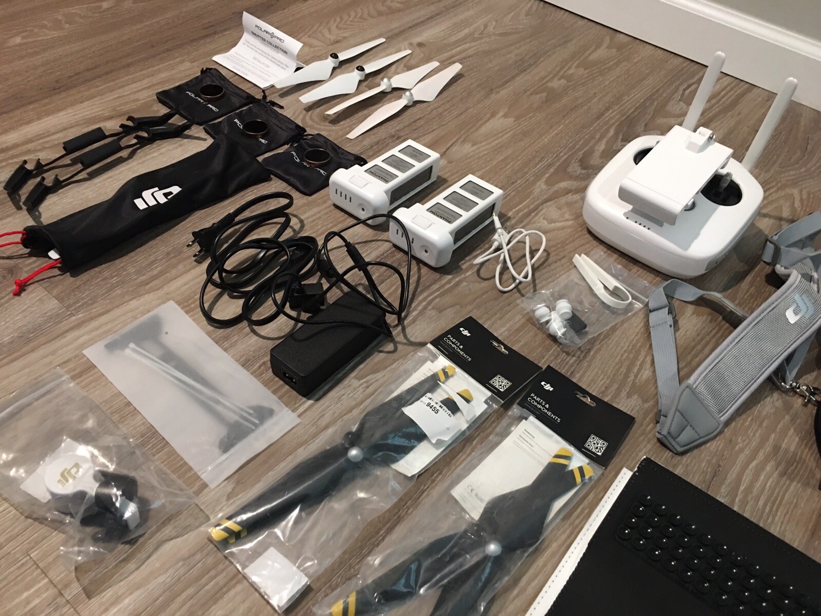 DJI Phantom 3 4K Camera Drone + Accessories. Included items: P3 4K Quad, Controller with neck strap, 2/DJI Smart Batteries, set of used Blades, set of New Blades in bag, set of New DJI Carbon reinforced Blade in Blk, all originals small parts, Original Battery Charger, Brand New set of Polar Pro ND Cinema Filters. Landing Pad, iPad hood Landing Skids and various extras. Professional GPC Waterproof Hard Case. Does not include Memory Card. You will this Drone is in Like-New condition. It has not been used much. This is an awesome kit for any pilot. This drone was designed for Photograph and Video. It is a discontinued collectors item. You will not find another kit like this one.