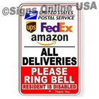 Available As An Aluminum Sign / Magnetic Sign / Vinyl Decal Aluminum Signs Are Available In Five Versions 5" x 7" / 8" x 12" / 12" x 18" Treated With Ultra UV Protection To Prevent Fading Printed directly onto the metal sign Signs do not have stickers, decals, paint or vinyl lettering Won't fade, crack, peel, chip or rust. 5" x 7" (.025 thickness) Signs have square corners, two strips of mounting tape and no holes 8" x 12" (.025 thickness) Signs have rounded corners and are available in TWO OPTIONS AVAILABLE WITH 1/4" MOUNTING HOLES ALSO AVAILABLE WITHOUT MOUNTING HOLES BUT MOUNTING TAPE IS ATTACHED TO THE BACK OF THE SIGN 8" x 12" (.032 thickness) Signs have rounded corners and two 1/4" mounting holes 12" x 18" (.032 thickness) Signs have rounded corners and two 1/4" mounting holes Decals are 4" X 6" Vinyl decals do not have holes Printed with eco-solvent ink guaranteed to last 5 to 7 years Decals are shipped USPS First Class Mail with tracking CUSTOM DESIGN DECALS ALWAYS AVAILABLE Magnetic Signs Offer The Option Of Being Removable You can display the sign on your garage door or front door when you are expecting a delivery and then remove it when no delivery is expected Perfect if you'd prefer not to have a sign mounted permanently Magnetic signs are 7" x 10" or 5" x 7" and have no holes PLEASE CHECK TO MAKE SURE THAT MAGNETS STICK TO THE AREA THAT YOU PLAN TO USE THE MAGNETIC SIGN Some doors are aluminum and the signs may not stick