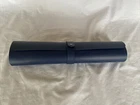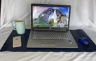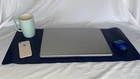 Desk Mat Navy Blue Medium 31” X 13” Waterproof Protector Mouse Pad. This desk mat provides a waterproof, smooth work surface. The desk mat is pictured with a 17” laptop, an iPhone 8 and a regular mouse. It will come rolled up and may need to be flattened with heavy books in order to lay completely flat.