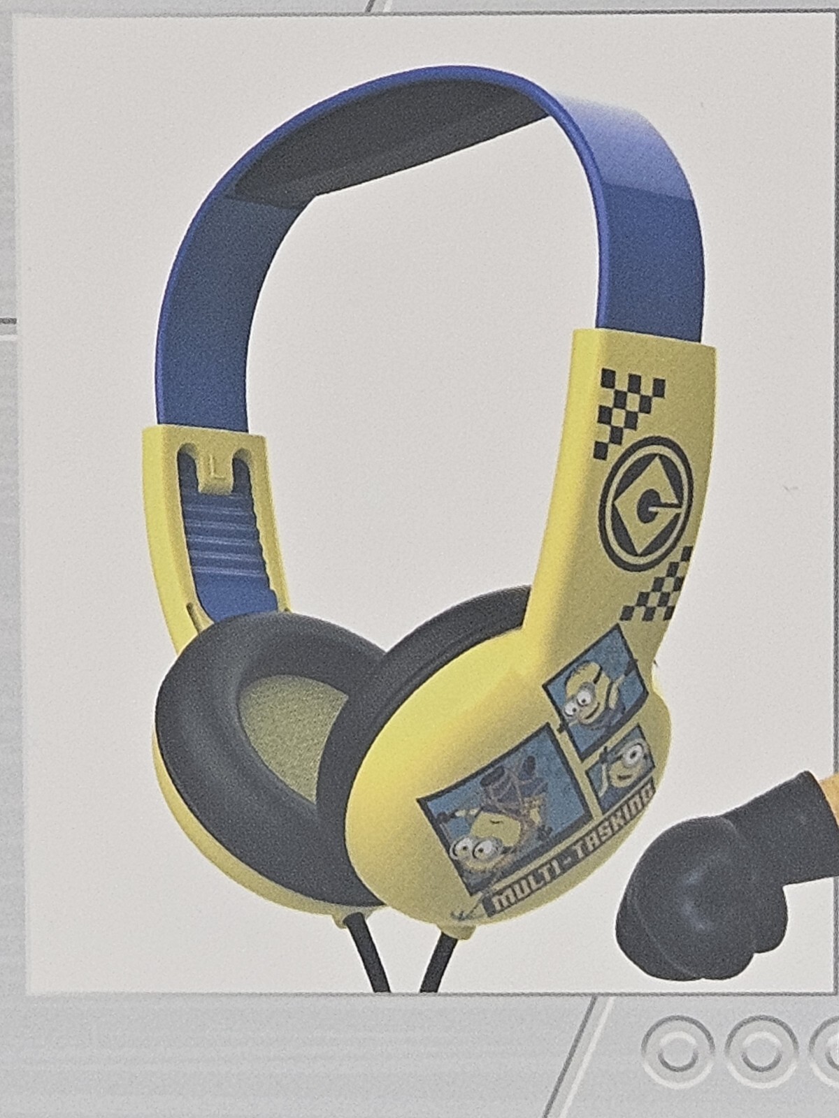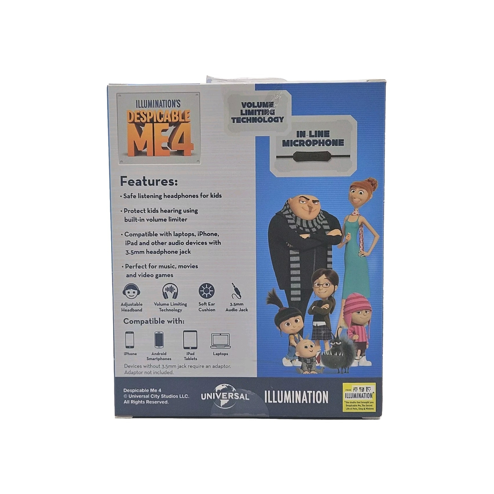 Despicable Me 4 Kids Safe headphones Wired HEADPHONES VOLUME LIMITING TECH Perfect for music, movies, video games & more. Color: Blueand Yellow Adjustable headband Soft ear cushions Volume limiting technology to protect children's ears Compatible: iPod®, iPad®, iPhone®, & other audio devices Specs: Driver diameter 40mm; impedance 32 ohms;