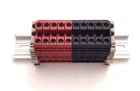 Technical Data (UL) Rated Voltage: 600V Rate Current: 50A Conductor Cross-section, Solid (AWG): 20-8 Conductor Cross-section, Flexible (AWG): 20-8 Rated Impulse Withstand Voltage: 8KV Torque (N-m): 1.2 Screw: M4 Wire Strip Length: 12-14mm Insulating Material: PA TxHxW (mm): 8 x 45 x 41.75 (Individual Blocks) DIN Rail (mm): 35, 32 Jumper/Bridge: Press-fit/Insertion. This assembly includes 5 DK6N-RD Dinkle terminal blocks, 5 DK6N-BK Dinkle terminal blocks, 2 SS2 end brackets, and 1 DK6NC-BK end cover, all mounted on a 6" piece of aluminum RoHS rail. The 10 blocks are all separate circuits. Prebuilt Assembly Red/Black Color UL 600V Rating UL 8-20 AWG Rating UL 50A Rating Separate circuits