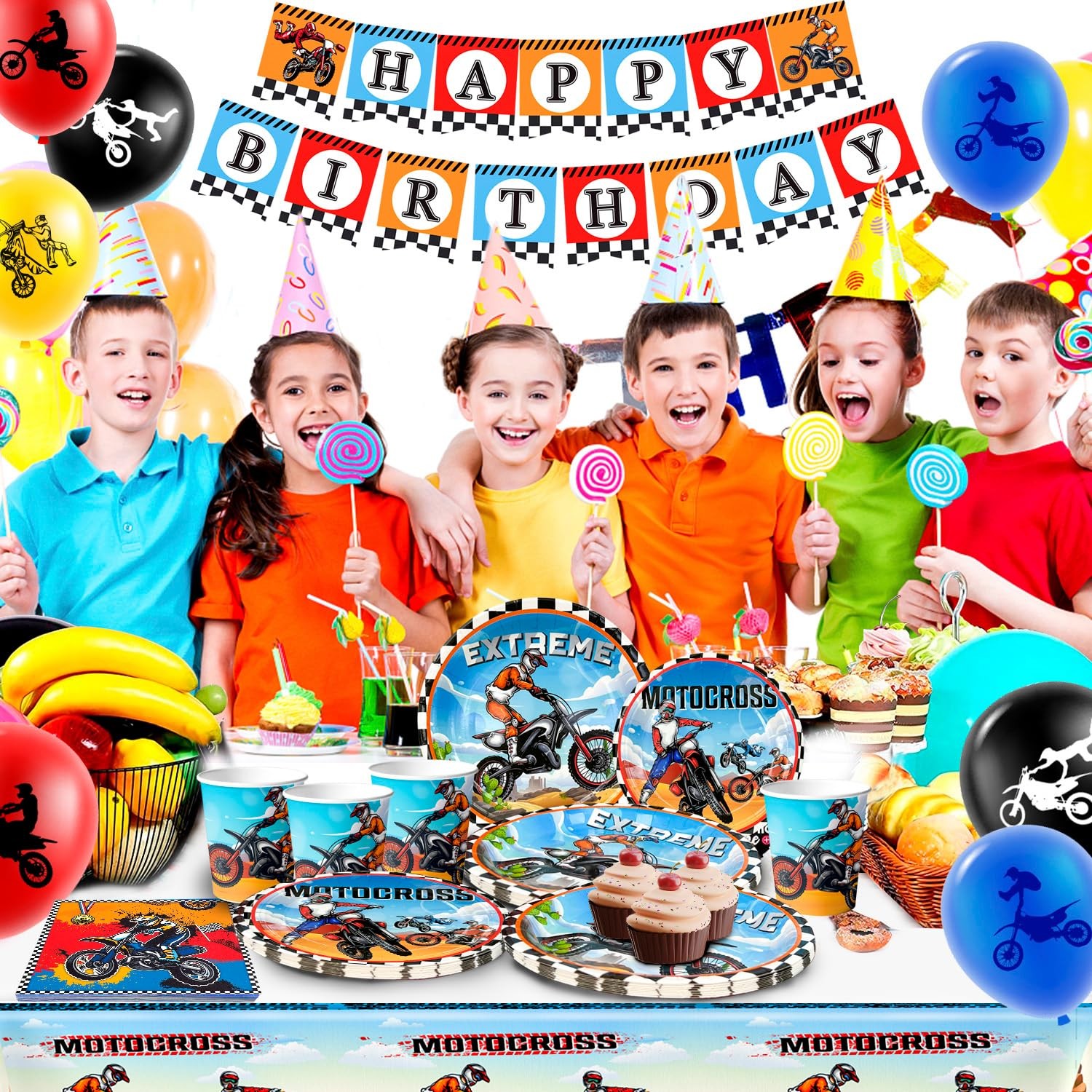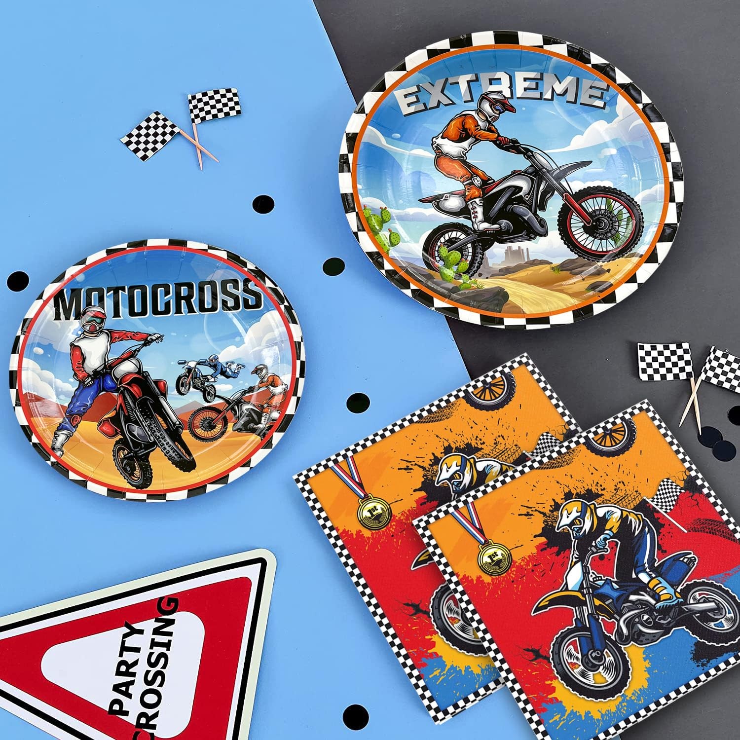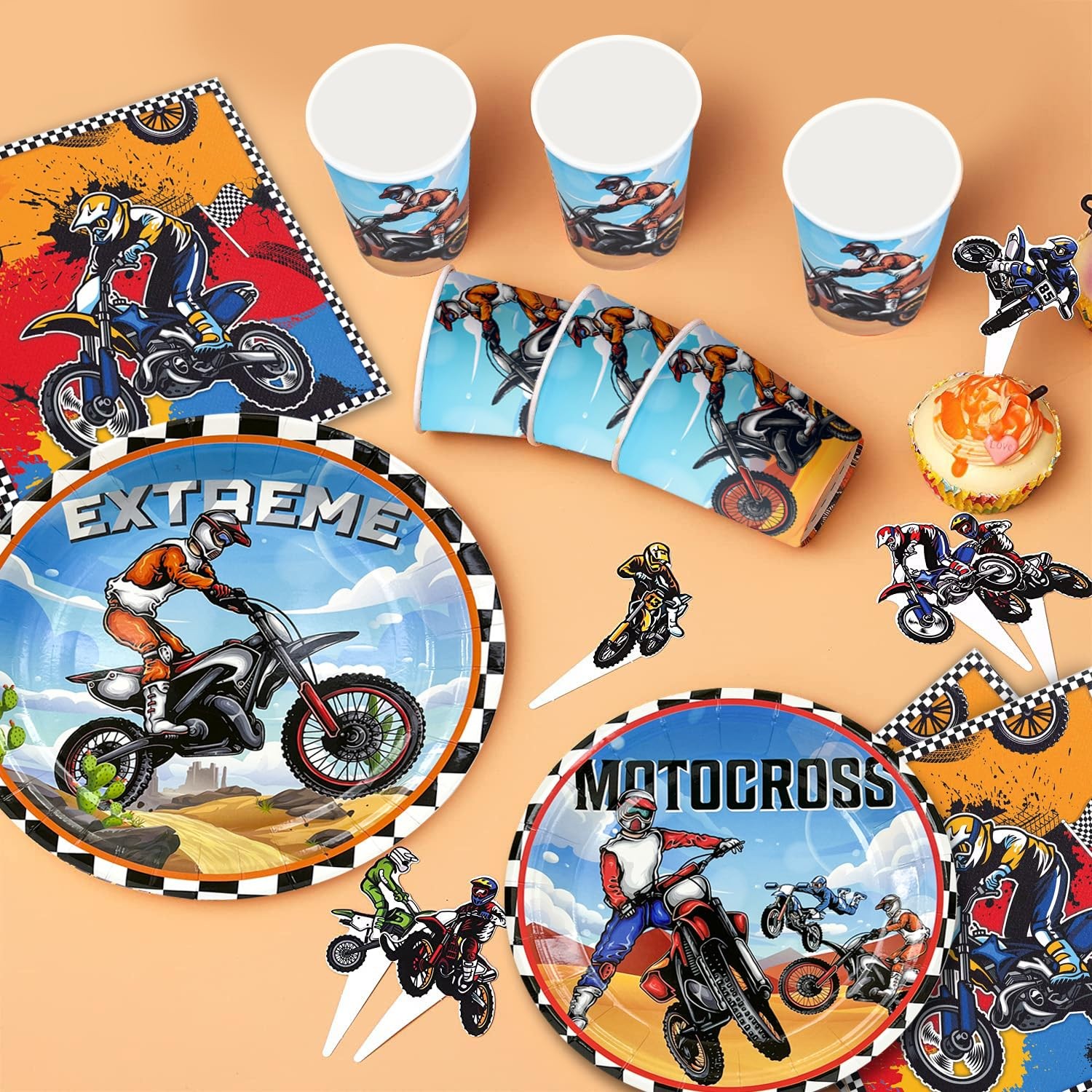 Motorcycle Birthday Supplies, Motorcycle Birthday Decorations Motorcycle Theme Party Tableware Set Dirt Bike Party Plates and Napkins Cups Banner Balloon etc Motocross Party Supplies for Boys Complete Motorcycle Birthday Party Supplies Set: Our dirt bike party supplies include 1 dirt bike happy birthday banner,1 dirt bike party tablecloth,10 7'' bike party plates,10 9'' motorcycle theme party paper plates,10 dirt bike birthday napkins,12 motorcycle latex balloon etc motocross birthday party supplies Unique Design: Motorcycle party decorations have many cool motorcycle theme element designs,unique printing patterns,let you feel the speed and passion in the motorcycle theme party High Quality Material: Bike party plates and napkins are made of high quality paper,and motorcycle balloons are made of natural latex material,so you can rest assured to use all the dirt bike birthday party supplies that appear in your motorcycle party Save Time: Choosing our dirt bike tableware will lighten your cleaning burden for motorcycle themed parties,you can simply throw away the dirt bike party cups and dirt bike party plates,saving time and effort Wide Applications: The motorcycle party decorations supplies can provide you with motorcycle theme parties,dirt bike party, motorcycle party,friends gatherings,motorcycle competitions and other occasions