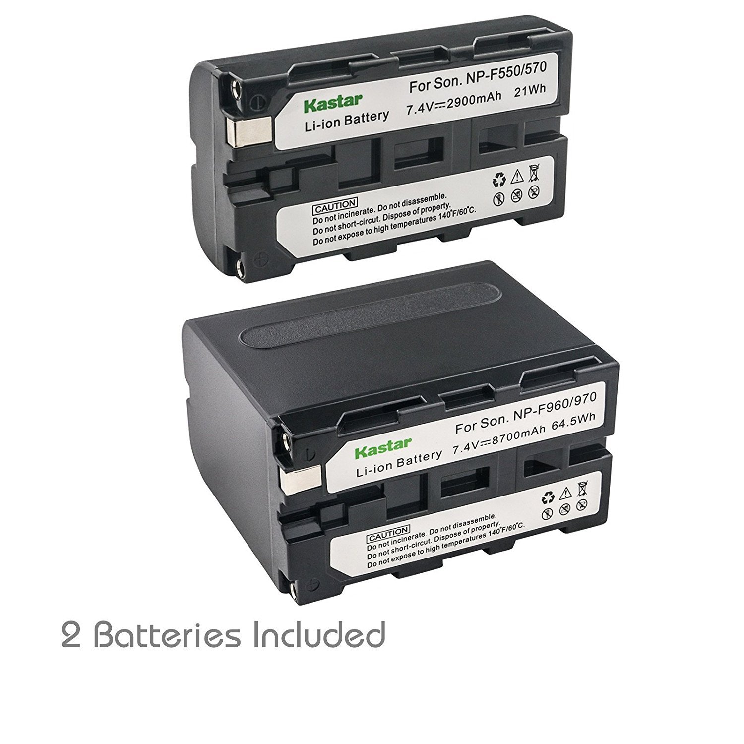 High Capacity: Kastar super high capacity battery will power your Camera & Camcorder for much longer. New smart LED design, easy to carry. Input: 5V 2A; Output: 8.4V 650mA*2; Intelligent LED charger displays charging status and battery capacity. Kastar Lithium-ion Battery pack’s cells meet UL1642 & CE safety standards, battery chargger meet UL60950-1 & CE safety standards, comes with built-in over-charge, over-discharge, over-voltage, over-current, and over-heating protection circuit to ensure that your lithium-ion battery and charger will be safe to use. Compatible with: Sony NP-F330, NP-F530, NP-F550, NP-F570, NP-F730, NP-F750, NP-F770, NP-F930, NP-F950, NP-F960, NP-F970, NP-F975, NP-F990, Sony DCR Series, DSR Series, HDR Series, FDR Series, HVR Series, HVL Series Camcorders and Monitor LED Video Light. Product description Battery Compatible: Sony NP-F330 NP-F530 NP-F550 NP-F570 NP-F730 NP-F750 NP-F770 NP-F930 NP-F950 NP-F960 NP-F970 NP-F975 NP-F990 Charger Compatible: Sony BC-VM10, BC-VM50, BC-V615 Sony NP-F330 NP-F530 NP-F550 NP-F570 NP-F730 NP-F750 NP-F770 NP-F930 NP-F950 NP-F960 NP-F970 NP-F975 NP-F990 NP-FM50 NP-FM55H NP-FM500H NP-QM1NP-QM91 Compatible the following models: Sony CCD-RV100, RV200 CCD-SC5, SC6, SC7, SC8, SC9, SC55, SC65 CCD-TR1, TR2, TR3, TR11, TR12, TR18 CCD-TR57, TR67, TR76, TR87, TR97 CCD-TR200 Series CCD-TR300 Series CCD-TR400 Series CCD-TR500 Series CCD-TR600 Series CCD-TR700 Series CCD-TR800 Series CCD-TR900 Series CCD-TR1100 CCD-TR2200, TR2300 CCD-TR3000, TR3100, TR3200, TR3300 CCD-TRV15, TRV16 CCD-TRV25 Series CCD-TRV35 Series CCD-TRV40 Series CCD-TRV50 Series CCD-TRV60 Series CCD-TRV70 Series CCD-TRV80 Series CCD-TRV90 Series CCD-TRV101 CCD-TRV201, TRV215 CCD-TRV315 CCD-TRV517 CCD-TRV615 CCD-TRV715, TRV716, TRV720 CCD-TRV815 CCD-TRV930, TRV940 CCD-TRV3000 DCR-SC100 DCR-TR7 DCR-TR7000, TR7100 DCR-TR8000, TR8100 DCR-TRV5, TRV7, TRV9 DCR-TRV49, TRV58 DCR-TRV103, TRV110, TRV120, TRV125, TRV130 DCR-TRV203, TRV210, TRV220 DCR-TRV310, TRV315, TRV320 DCR-TRV420 DCR-TRV510, TRV520, TRV525 DCR-TRV620 DCR-TRV720, TRV735 DCR-TRV820 DCR-TRV900, TRV935 DCR-VX9 DCR-VX2000, VX2001, VX2100, VX9000 DSC-CD250, CD400 DSC-D700, D770 HDR-AX2000 HDR-FX1 HDR-FX7 HDR-FX1000 HVR-V1U HVR-Z7U HXR-NX5 HXR-NX5U NEX-FS100 Monitor LED Video Light