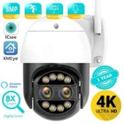 New Arrival 4K 8MP Dual Screen Camera 4K 4MP 8MP Dual Lens 8X Zoom PTZ WIFI CAMERA 4MP 8MP Dual Lens 8X Zoom PTZ WIFI CAMERA 2.8mm + 12mm Dual-lens Design 2.8mm near-focus ultra-wide-angle lens + 12mm telephoto lens dual-lens design, you can switch different lens vision according to your needs Main Features: ● Ultra HD 4MP/8MP Resolution for option; ● 2.8mm+12mm dual lens design; ● Smart Ai Humanoid detection: mixing line, area, two-way flow detection, for the human form, the item triggers no alarm ; ● Support DIY Alert Voice and Alarm Bell / Customized new speakers with loud volume (4w high power) ● Three Night modes Setting: blacklight full-color infrared night vision double light warning ; ● Support AP Direct Connection / Wireless Connection / Wired Connection; ● WiFi Connection: the camera only supports 2.4G HZ WiFi, it doesn't support 5G HZ WiFi; ● Wired Connection: the camera with an RJ45 LAN port, you could also connect the camera with the network cable(when you without wifi); ● Support vision 8 times magnification(only support 8x digital zoom, it doesn't support 5x optical zoom) ; ● Supports full-time loop recording, when the Sd card is full, the old video will be covered view the new recording automatically. Support Motion Alarm Recording, you could just record when it detects movement to save more storage for your SD card and cloud storage ; ● Support Two Modes Recording: Free 30-day cloud storage, Max 128G SD card Record, data security is more stable ; ● P2P Remote Access/Multi-User: P2P technology let you be able to view the live situation of your house wherever you are, just with the P2P account on the app via your Smartphone or tablet. ● PTZ: rotates 270° Horizontally and 100° Vertically ; ● H.265X new storage design, TF card storage is lower, more stable, and more durable ; ● Xmeye independently developed the RTS Cloud architecture, which is faster and the preview is more stable ; ● Special Technology: Exclusive patented spherical heat treatment, with an average of 30 degrees, let the screen exposure heat dry and disappear. Package Contents 1x PTZ Camera 1x User Manual 1x Power Supply(shorter than 1 meter) 1x Screws Bag Warm tips: the SD Card is optional :) Remark If you need Power Extension Cable to extend this power supply. Please Click "Buy Now" to get 3m Power Extension Cable. Voice Command Works with Alexa. Voice command like: alexa, show me the front camera 8X Digital Zoom If you need view more details, press and hold the screen with both hands to Zoom in/out and see more details, digital zoom is photo zoom instead of optical zoom. 4MP VS 8MP High Resolution 4MP camera version: Indicates that the single lens is 2MP, so the dual-lens is 2MP+2MP=4MP; 8MP camera version: Indicates that the single lens is 4MP, so the dual-lens is 4MP+4MP=8MP. Motion detection After locking the target, the camera will adjust the pan rotation automatically, Tracking Moving Objects, Cars, Pets, humans, and push alert notifications to your Smartphone. PTZ Remote Control Rotates 270° Horizontally and 100° Vertically . You can control it in the ICSEE app directly whenever you want and wherever you are . Ai Human Detect Alert Quickly finds human targets and immediately sends a notification to your phone, letting you see what happens anywhere. It only detects the human shape and will not trigger falsely for objects such as cars and trees. Smart Dual Light Modes Built-in 4Pcs White LED and 4Pcs IR LED . Monitor moving objects, automatically illuminate.This is an impressive little weapon against crime . Camera could show colorful vision at night too , there are three night modes for you to select . Real Two Way Audio Built-in microphone and speaker / Customized new speakers with loud volume . You could talk to anyone nears the camera ( Warn someone to leave your house ) Wifi Connection & LAN Connection Powered by DC12V adapter, You can connect the camera to Wi-Fi network. you can setup wifi connection of the camera or LAN Search with network cable connected to router, work with 2.4G wifi only (Does not support 5G) IP66 Waterproof / Dustproof The camera case is made of high-quality ABS plastic , which is waterproof, sun-proof and dust-proof. It is suitable for any environment . Support Onvif and preset Cruise Support Onvif , It can be connected to a third-party NVR centralized management camera: Support multiple preset cruise function SD Card & Cloud Storage Free 30-day cloud storage and Max 128G SD card Record ,data security is more stable . If you want to keep using Cloud Service, you just need to pay for it , if you don't need to use , it will stop it automatically when you don't pay for the fee . P2P Remote Access/Multi-User Share the same Vision with your families , let all of you protect and pay more attention to your house. P2P technology let you be able to view the live situation of your house wherever you are , just with the P2P account on the app via your Smartphone or tablet . Details