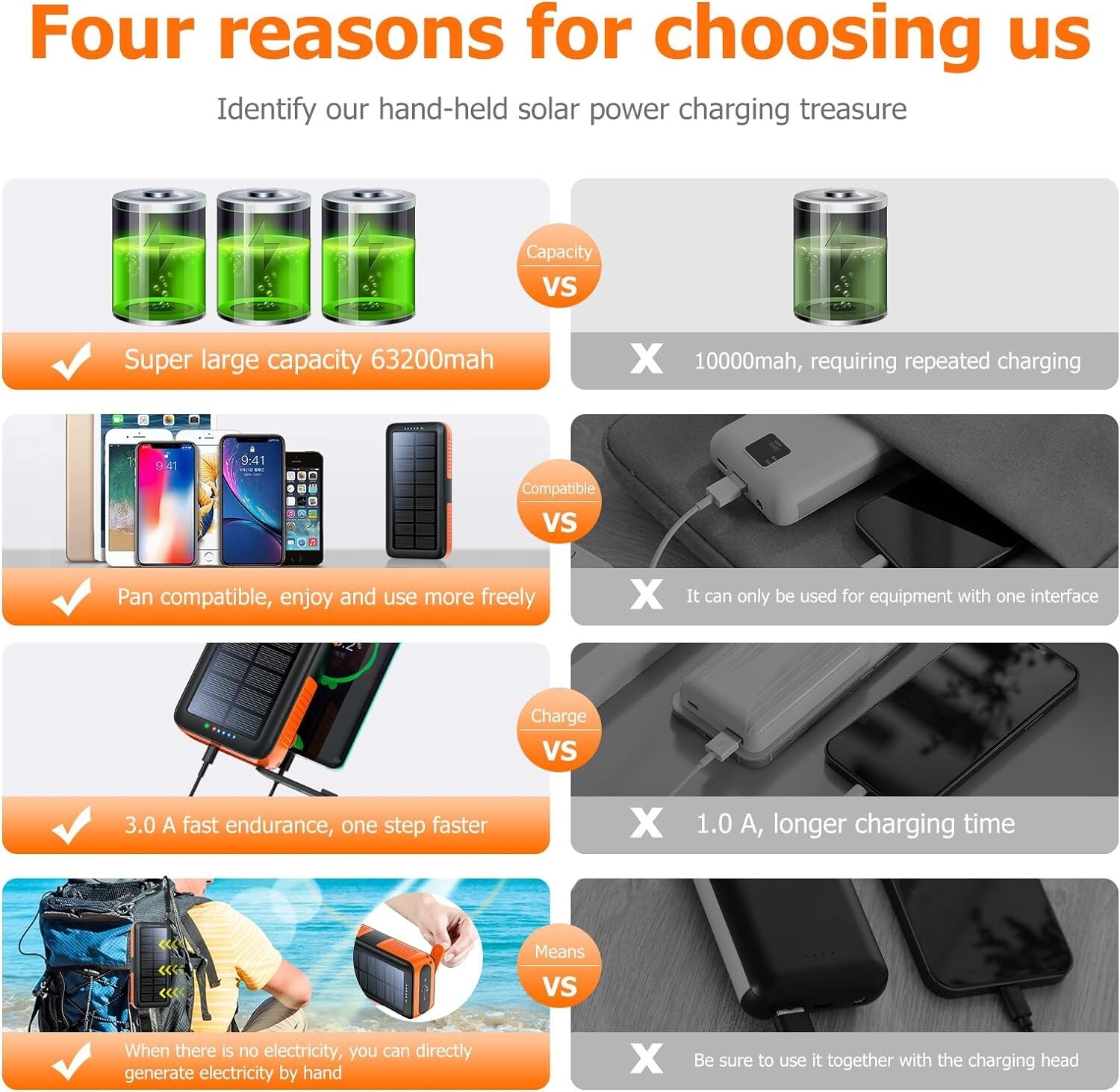 Portable Charger with Dual Outputs & LED Flashlight for Camping Survival ‹ › ‹ › ‹ › ‹ › ‹ › ‹ › ‹ › ‹ › ‹ › Portable Charger with Dual Outputs & LED Flashlight Perfect for Camping Survival Features: Impressive 63200mAh solar power bank, liberating you from battery anxiety. Built-in 4 LED flashlights with 3 modes: lighting, flashing, SOS. Integrated solar panel for convenient outdoor charging - simply hang on your backpack. Universal compatibility with most devices: cellphone, camera, MP3, MP4, PSP. Automatic output adjustment to protect against overcharging, over-current, over-voltage and short circuits. Dual input ports (Type-C & Micro) for fast charging in 9-12 hours. Hand crank charging option for emergencies when sunlight isn’t available. Durable ABS material making it waterproof, dropproof, and dustproof. Long-lasting with over 1600 charge life cycles. Benefits: Never worry about battery life during your adventurous escapades. Versatile LED flashlight serves multiple purposes – from camping lamp to emergency SOS signal. Reliable power source for all your devices with minimal risk of damage. Durable design ensures it withstands extreme environments and outdoor conditions. Enjoy peace of mind with a friendly 24-hour after-sales service and lifetime customer support. Why Choose Our Portable Charger? Embark on your next outdoor adventure without fear of running out of power. With a staggering 63200mAh capacity, our Portable Charger not only keeps your devices charged but also lights up your path with its built-in LED flashlight. Whether you’re camping, hiking, or in need of emergency power, our charger provides universal compatibility and cutting-edge security features that protect against overcharging. Rely on the hand crank option when sunlight isn't plentiful, ensuring you stay connected in any situation. Don’t wait! Equip yourself with the ultimate portable power bank—your adventure awaits! Shipping Free & Fast Shipping - We offer free shipping to most of the USA with a normal delivery time of 3-7 days. However, due to the current situation, additional delivery time (up to 3 weeks) may be required for some items. Alternative Carriers - We may use alternative carriers (e.g. USPS, FedEx, UPS, etc.) to ensure your package arrives safely and on time. Due to the use of multiple carriers, we are unable to provide a tracking number automatically. Handling Time - Orders are processed and shipped within 1-2 business days of receiving cleared payment. Shipping Restrictions - Shipping to Alaska, Hawaii, Puerto Rico, Guam, and other US territories may incur shipping charges or delivery restrictions. Please contact us before ordering, or your order can be refunded/cancelled. State Restrictions - There may be restrictions based on your state of purchase. For example, certain items may not be shipped to California due to state regulations. Contact for Tracking Updates - If you require tracking updates or have any concerns about the delivery of your order, please feel free to contact us, and we will be happy to assist you. Return Please see our eBay Return Policy. Thank you. Payment We accept all major credit cards, PayPal, and Apple Pay for your convenience. Your payment information is secure and encrypted to ensure a safe and seamless transaction. Please complete your payment within 3 days of purchase to avoid any delays in shipping. Feedback Your feedback is extremely important to us. We strive to provide the best products and customer service possible. If you are satisfied with your purchase, please take a moment to leave us a positive review. If you have any concerns or issues with your order, please contact us before leaving negative feedback. We are committed to resolving any problems and ensuring your satisfaction. Contact Us If you have any questions or concerns, please feel free to reach out to our customer support team. You can contact us through the eBay messaging system. We are available Monday to Friday, 9:00 am to 5:00 pm EST, and we will do our best to respond to your inquiry within 24 hours. Thank you for supporting our small family business! UPC: Not Set Wireless Charging Standard: None Item Height: Not Set Item Length: Not Set Item Weight: 1.5 pounds Item Width: Not Set Unit Quantity: 1 Connectivity: USB,USB Type C,Micro USB Items Included: 1X User manual Mounting Location: Not Set Compatible Brand: Not Set Compatible Model: Universal,Universal for cellphone,Universal for camera,Universal for MP3,Universal for MP4,Universal for PSP Design/Finish: Orange Features: Dustproof,Fast Charging,LED Flashlight,3 Lighting Modes,SOS Signal,Solar Panel,Hand Crank Charging,Over Voltage Protection,Weather Resistant,Waterproof,Dropproof Theme: Not Set Brand: Unbranded Type: Portable Charger Number of Ports: 2 Color: Orange Voltage: 5 V Material: ABS Cable Length: Not Set Mounting Type: Not Set MPN: Not Set Country/Region of Manufacture: Not Set Manufacturer Warranty: Not Set Unit Type: lb Personalize: Not Set