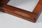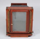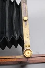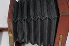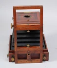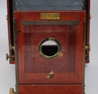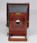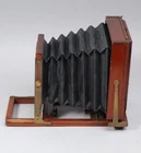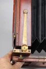 Eastman Dryplate & Film Company 5x8 Interchangable View camera with two plate holders and bed extension. Mahogany with brass furniture. I believe the camera, serial number 168, is a late 2nd or 3rd variation because it does not have the hinged ground glass mechanism. The camera does not come with a lens but it has the lens board with a brass 1 9/16" threaded lens mounting flange. The bellows has pinholes. The controls for the standard adjustments work correctly. The ground glass is undamaged. There is some minor damage to the rails of the bed extension which can be seen in the photos. This does not affect usability. The wood Rochester Optical Co. plate holders are in good shape and are perfectly usable. The camera could also use period 5x7 holders to make it more useful in modern times