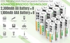 EBL Rechargeable AA and AAA Batteries, 1.2V NiMH AA Battery 2300mAh (8 Counts) and AAA Battery 1100mAh (8 Counts) About this item Package: EBL 8 Counts AA 2300mAh rechargeable batteries and 8Counts AAA 1100mAh rechargeable batteries. High Capacity: 2300mAh AA rechargeable batteries and 1100mAh AAA rechargeable batteries providing a long use time and performance well. Low self-discharge - Embedded seal structure expand the space of crystal lattice, make more room for hydrogen, so EBL batteries will holds 80% power after 3 years. Embedded seal structure, ultra slim and make more inner space, DBCK steel shell can protect the AA battery against explosion due to overpressure. High Quality Ni-MH battery, 1.2V rechargeable batteries no memory effect, can be charged and used at anytime. Product Description Previous page Next page RECHARGEABLE BATTERIES UL SAFER BATTERIES POWER WHAT YOU WANT On Oct 15, 2024 at 01:38:14 PDT, seller added the following information: