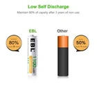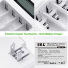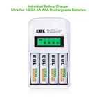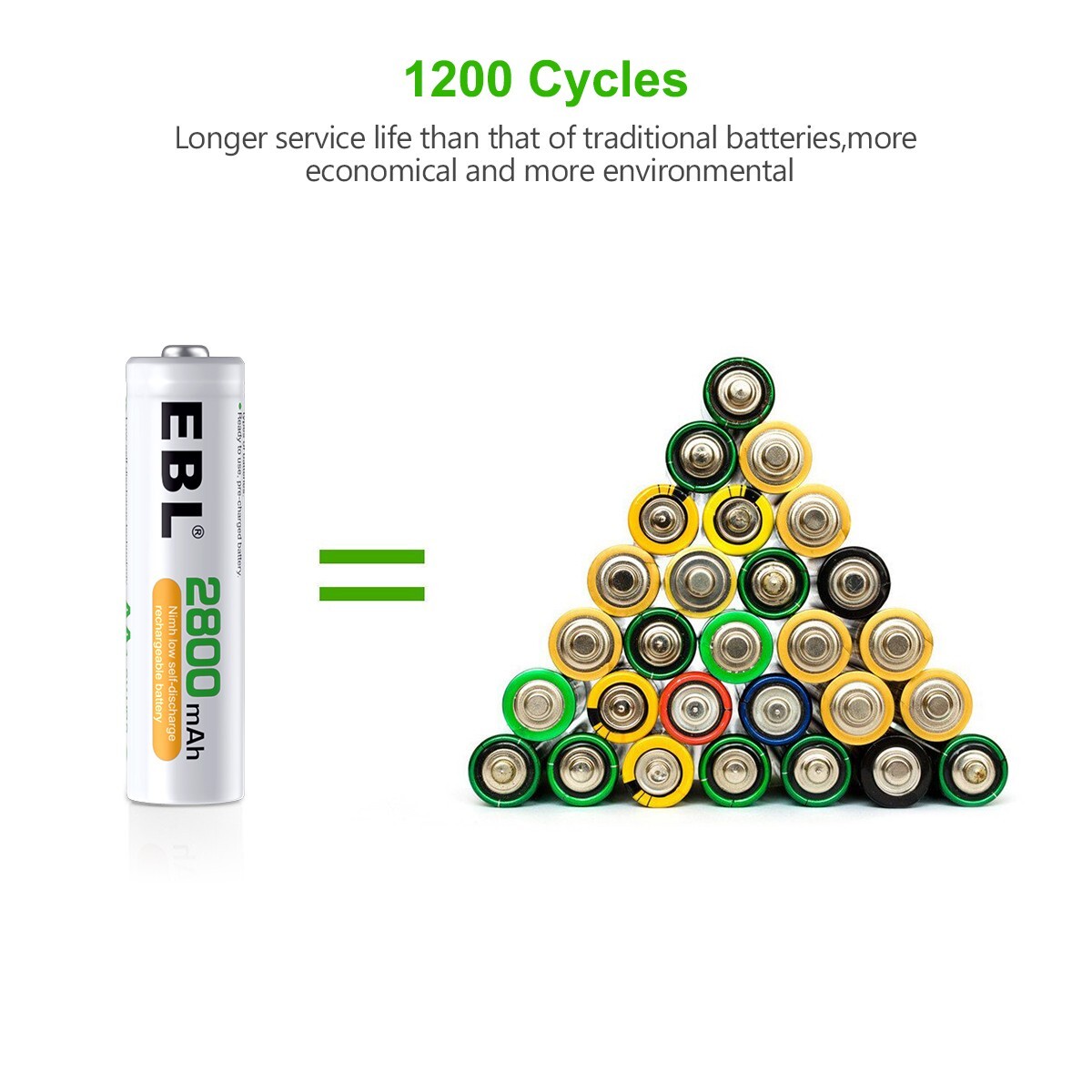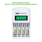 EBL Rechargeable AAA AA Batteries 1100mAh (8 Counts) / 2800mAh (8 Counts) with 907 LCD Individual AA/AAA Rechargeable Battery Charger About this AA AAA Battery 1200 Tech, ProCyco (Professional recycle) helps maximize its best power performance while charging. High capacity - No longer to worry about the endurance of the batteries, EBL 1100mAh AAA 2800mAh AA 1.2V batteries will provide ultra strong power for your devices to performance well and operate longer. Supercell lattice - EBL batteries made in supercell lattice technology, make it more inner space to contain such high volume power juice, provide constant voltage and best performance in heavy load discharge. Low self-discharge - Embedded seal structure expand the space of crystal lattice, make more room for hydrogen, so EBL batteries will holds 80% power after 3 years benefit from its concentration to low self-discharge project. Safety assurance - Ni-MH eco-friendly cell, doesn’t contain Hg/Cd/Pb, makes no pollution to the environment, and using DBCK steel shell which can protect the battery against explosion due to overpressure. Specification; AAA Rechargeable Battery * Capacity: 1100mAh * Voltage: 1.2V * Battery type: AAA R03 * Chemical Composition: Ni-MH * Total Weight: 60g * Quantity: 8pcs AA Rechargeable Battery * Capacity: 2800mAh * Voltage: 1.2V * Battery type: AA R6 * Chemical Composition: Ni-MH * Total Weight: 60g * Quantity: 8pcs * Each 4 batteries come with 1 case box About this Battery Charger Individual charging status for each slot, can freely charge 1,2,3,4 Ni-MH Ni-CD AA/AAA rechargeable battery. Smart LCD to show its charging progress separately, the battery icon stop flashing when fully charged.“CHG” -- Charging; “ERROR” -- install the battery incorrectly or the battery is broken one. Advanced MCU control and -∆V function, over-heat and over-current protection, short-circuit protection, non-rechargeable and defective battery detection. Trickle charged mode will help maximize the capacity of battery to full. Worldwide usage: 100-240V AC, 50/60 Hz. Model EBL 907 is professional on AA, AAA Ni-MH/Ni-CD rechargeable battery. Individual function helps to charge batteries in pairs and single. Compatible: Can both charge 1,2,3,4 AA and AAA Ni-MH Ni-CD rechargeable batteries individually.(Do not charge alkaline or Lithium batteries) Features of charger Input: 100-240V AC, 50/60 Hz 500mA Max Output: 1x AA 1.2VDC 1800mA, 1x AAA 1.2VDC 1800mA; 2x AA 1.2VDC 900mA, 2x AAA 1.2VDC 900mA; 3x AA 1.2VDC 500mA, 3x AAA 1.2VDC 500mA; 4x AA 1.2VDC 500mA, 4x AAA 1.2VDC 500mA; On Oct 31, 2024 at 02:28:17 PDT, seller added the following information: