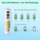 Feature: # For Charger # 【2 IN 1 Function Battery Charger】- EBL 2023 newest version 8-bay LCD battery charger with built-in cable or micro USB two ways input. Portable and convenien just need a adapter plug in to use, without any extra cable. 【Individual Slot Design】- Individual and reasonable battery charging slot design, supports mixed charging mode, fits for 1-8 AA/AAA, Ni-MH/Ni-Cd rechargeable batteries. 【2X Faster & Smart Charge】- DC 5V/2A input, up to 500mA charging speed for each slot. Built- with smart technology when the battery is fully charged, it will automatically stop charging. 【Intelligent LCD Screen Charger】- Intelligent LCD screen can monitor battery charge status, process, and detect broken battery. 【Safety Protection】- Controlled by MCU and multiple protection, over charge, over current, over voltage, over heat, short circuit protection. Constant current charging protects the batteries from current fluctuation. 【EBL Rechargeable AA Batteries】- ProCyco technology - 1200 Tech, ProCyco (Professional recycle) helps maximize its best power performance while charging.(NOTE: Please to Charge Before Use for Better Effect) EBL AA AAA Rechargeable Batteries 800/1100/2300/2800mAh NI-MH / LCD Charger Lot 1.2V AA AAA NI-MH Batteries 800mAh Rechargeable /8-Bay LCD Batteries Charger LOT EBL Lot AA AAA Rechargeable Batteries 2300mAh / Smart 8-Bay LCD Battery Charger # For AA AAA Rechargeable Battery # Descriptions : * This is 4 in 1 EBL AA AAA rechargeable NI-MH rechargeable battery, up to 1000 recharge times. Durable for high power demend devices such as Digital Cameras, CD Players, Remote Control Vehicles, Metal Detectors, Pocket Flashlights, PDAs Palm Pilots, Pagers, Game Boys, Children's Toys..etc Features * 100% Brand new and high quality * It is 4 in 1 EBL AA AAA rechargeable NI-MH replacement battery * The latest lock electric technology are adopted * Nimh environmental protection material * Rechargeable battery, up to 1000 recharge cycles * Excellent high discharge/drain performance * Exact replacement for standard AA AAA size batteries * Superior performance under low temperature condition * Longer in high drain devices than Alkaline batteries * Can be commonly usedd for for high power demend devices such as Digital Cameras, CD Players, Remote Control Vehicles, Metal Detectors, PocketFlashlights, PDAs Palm Pilots, Pagers, Game Boys, Children's Toys, etc Specification: AAA Rechargeable Battery * Capacity: 800/1100mAh * Voltage: 1.2V * Battery type: AAA R03 * Chemical Composition: Ni-MH * Total Weight: 60g * Each four batteries come with one case box AA Rechargeable Battery * Capacity: 2300mAh/2500mAh/2800mAh * Voltage: 1.2V * Battery type: AA R6 * Chemical Composition: Ni-MH * Total Weight: 60g * Each four batteries come with one case box Package Included : As you choice On Feb 11, 2025 at 02:16:33 PST, seller added the following information: