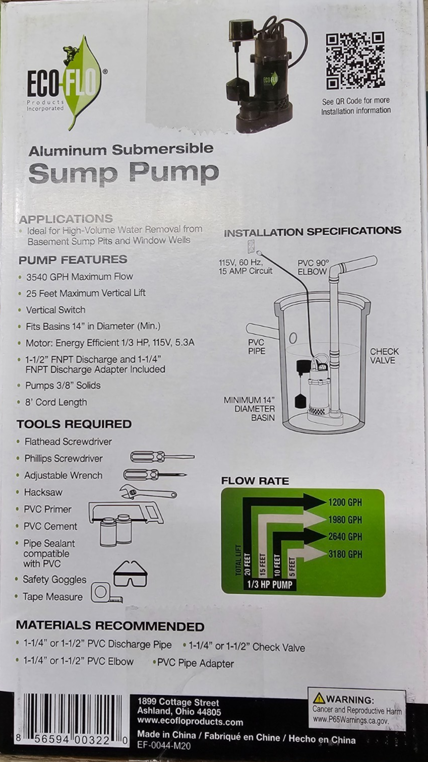 FEATURES: Aluminum Construction Built-in Overload Motor Protection Wide Angle Switch - Operates in basins 14” in diameter Solids Handling Vortex, Thermoplastic Impeller - 3/8” Solids Handling