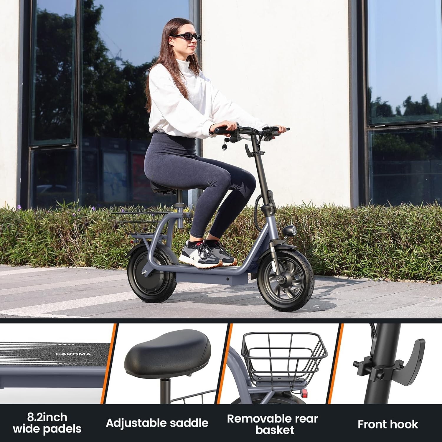 Product Description About this item 【48V Battery and Peak 1200W Powerful Motor】The electric scooter for adults is equipped with a 48V/10.4Ah battery, which can last for a long time without frequent charging, with a maximum range of up to 30 miles and a maximum speed of 20mph, and it only takes 7 hours to fully charge. The motor has a peak power of up to 1200W and can easily climb a 30-degree slope, making it very suitable for short-distance commuting 【LED Display and 3 Speed Modes】The electric scooter adults is equipped with an LED high-definition display, which can clearly display: speed mode, battery power, current speed, and mileage during the day and at night. The caroma scooter uses a half-turn handlebar design, getting rid of the traditional full-grip speed control mode to ensure riding safety; the scooter has 3 different speeds for you to choose, giving you a better riding experience 【Excellent shock-proof suspension and brake system】This electric scooter with seat for adults has an excellent shock absorption system composed of headlights and taillights, electronic horns, front forks and sensitive double disc brakes, which can brake quickly, safely and stably; durable one-piece wheels and thick steel frame can withstand high-intensity pressure, with a maximum load-bearing weight of 265 pounds, suitable for heights of 3'11"-5'11" 【 Foldable Electric Scooter with Seat】Caroma electric scooter is equipped with an 8.27-inch wide deck, a soft seat that can be adjusted according to different heights, and a storage basket on the back seat; the front of the vehicle is compact and foldable, making it easy to store in a car trunk or other small space 【Caroma Electric Scooter After-Sales Support】Caroma electric scooter with Seat is UL 2272 certified. This detachable electric scooter is 90% assembled and comes with instructions and installation tools, making installation very easy. If you encounter any problems, such as motor failure, charging problems, or missing accessories, please contact us in time
