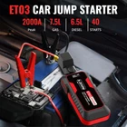 ET03 Car Jump Starter 2000A Jump Starter Battery Pack for Up to 7.5L Gas and 6.5L Diesel Engines, 59.2Wh Portable 12V Jump Box with USB Ports, LCD Display, Storage Case, and LED Light Product Details Brand: S ZEVZO Product Dimensions: 1.5"D x 3.4"W x 7.5"H Item Weight: 1.1 Pounds Amperage: 2000 Amps Peak Output Current: 2000 Amps Manufacturer: DONGGUAN CHUANGYI NEW ENERGY TECHNOLOGY CO., LTD Model: jump starter Item Weight: 1.1 pounds Item model number: ET03 Batteries: 1 Lithium Ion batteries required. (included) Manufacturer Part Number: ET03 Brand: S ZEVZO Product Dimensions: 1.5"D x 3.4"W x 7.5"H Item Weight: 1.1 Pounds Amperage: 2000 Amps Peak Output Current: 2000 Amps Battery Cell CompositionVoltage: Lithium Ion12 Volts Vehicle Service TypeBattery Capacity: Passenger Car, Motorcycle, RV, UTV, Truck, Tractor, Lawn MowerPassenger Car, Motorcycle, RV, UTV, Truck, Tractor, Lawn MowerPassenger Car, Motorcycle, RV, UTV, Truck, Tractor, Lawn Mower See more 16000 Milliamp Hours POWERFUL CAR BATTERY JUMP STARTER: The ET03 car battery jump starter can easily jump-start all 12V common vehicles with up to 7.5L gas and 6.5L diesel engines in seconds with its peak current reaching 2500 amps. Supports 40 jump starts at most on a single charge and suitable for lawnmowers, motorcycles, passenger cars, trucks, and even boats, etc. BACKUP PORTABLE POWER BANK: This jump starter battery pack can also work as a 59.2Wh large battery capacity portable power bank to charge your smartphones, tablets, or other USB electric devices. Two 5V/2A USB output ports are packed on this jump starter that can be applied at the same time for charging, 50% faster than a standard charger. PACKED WITH LED EMERGENCY LIGHT AND BONUS FEATURES : the ET03 car jump starter is packed with a 400-lumens LED flashlight to provide help in darkness or for emergency situations that support three variable light modes (stable, strobe, and SOS). There are more features included such as an LCD screen to check the battery status, a wide working temperature from -4℉ to 140℉, and 24 months long standby time. 10 INTELLIGENT SAFTY PROTECTIONS: This jump starter battery pack is super safe to use with 10 intelligent safety protections against overcharge, short circuits, reverse polarity, power surging and sparking, and so forth. You can detect the errors by simply checking the lights and the beep sound from the smart jumper clamps. WHAT YOU GET & SERVICE: the package you get includes 1 * SZEVZO ET03 Jump Starter, 1 * Smart Jump Cables, 1 * USB Type-C Charging Cable, 1 * Storage Case, 1 * User Manual. This jump starter is covered by our 2 years service, so please contact us if you have any questions or if you are facing any issues with this jump box.