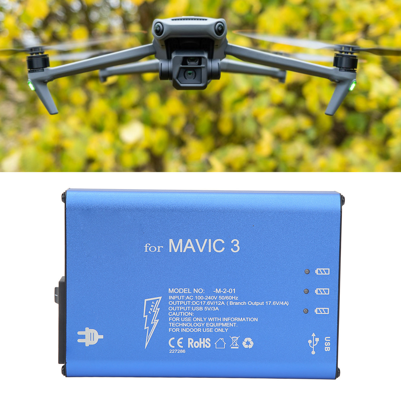 Feature: 1. Premium Material: Made of premium aluminum alloy for shell and electronic components, the drone battery charger is , , practical, safe and assured for you to use. 2. Suitable: The blue drone battery charger is suitable for 3, you can use it for charging corresponding unmanned aerial vehicle to meet your needs. 3. Efficient: The drone aluminum alloy battery charger can charge three batteries and a remote control at the same time, takes about 90 minutes to fully charge 3 batteries. 4. Safe: The shell of drone charger with switch is anodized, non conductive and grounded. The built in safety system protects the charger from overcharge, overvoltage and short circuit. 5. Cooling Fan: The UAV charging tool has built in cooling exhaust fan, effectively reduce internal heat, prevent high temperature when charging. Specification: Item Type: Drone Battery Charger Material: Aluminum Alloy for Shell, Electronic Components Weight: Approx. 900g/1.98lb Color: Blue Output: DC 17.6V, 12A (Each Channel 17.6V, 4A) USB Output: DC 5V, 3A (Each Channel 1.5A) Charging Time: It Takes About 90 Minutes to Fully Charge 3 Batteries Suitable: For 3 Package List: 1 x Drone Battery Charger 3 x Battery Charging Cable 1 x Power Supply Cable 1 x Use Manual 1. Our listing price includes the value of goods,packaging cost,and export taxes,not including international duties. 2. duties,taxes,and charges are not included in the item price or shipping fee. 3. T he duties are buyers' responsibility .Please check with your country's customs office determine what these additional costs will be prior to your purchase. 4. All disputes arising from the duties will be submitted to ebay for solution. 1. Any questions, pls. contact us via ebay message or email us. We will reply your message within 48 hours. If you do not receive our reply within 48 hours, pls. post a message again because sometimes our message system may block some emails. 2. If you are satisfied with our service, pls. kindly leave us a positive feedback and give us the Detailed Seller Rating with all " 5 " in very area 3. Our aim is to provide Level Customer Service, your recognition will encourage us greatly and serve you better. We strive to keep all our customers satisfy. We will do our up most to exceed your expectations in customer service, communication and dispatching of your orders. On Mar 2, 2025 at 19:36:43 PST, seller added the following information: