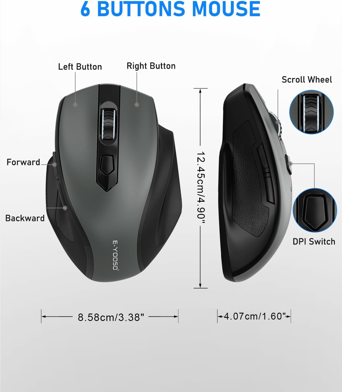 Store New Arrivals Add to Favorite View Feedback Contact E-YOOSO Wireless Mouse, 2.4G USB Computer Mouse with 5 Levels 4000 DPI,18 Months Description Item model number E-1141 Color Gray Product Dimensions 4.9 x 3.38 x 0.1 inches Country of Origin China Batteries 2 AA batteries required. Item Weight 3.2 ounces Connectivity Technology 2.4GHz USB Wireless Movement Detection Technology Wireless, USB, Optical Special Feature Large, Wireless, Portable, Touch Scroll, Comfortable, Ergonomic Design, Auto-Sleep Brand E-YOOSO Manufacturer E-YOOSO 【PLUG AND PLAY, NO DELAY】: No need to install drivers, 2.4GHz wireless provides a powerful and reliable connection up to 33ft (10m), which eliminated delays, interference. Easy and convenient (USB RECEIVER is stored at the back of the mouse) 【5 LEVELS DPI & 6 BUTTONS】: E-YOOSO wireless mouse has a 5-Level adjustable DPI (800/1200/1600/2400/4000), which provides more sensitivity than standard optical mice for smooth and precise. Extra 2 Side Buttons ideal for both work and gaming 【ANTI-SWEAT & ERGONOMIC】: The Mouse for big hands is made of anti-slip and anti-sweat material, large size design, built with a comfortable contoured shape that naturally fits hands. The finger rests on both sides of the mouse provide additional support 【AUTO SLEEP MODE DESIGN】: Being impressively easy to use, this big wireless mouse also keeps energy efficiency in mind. It will enter auto power-saving after 1 minute of idling, or sleep mode after 8 minutes of idling. Double click any keys to wake up 【UNIVERSAL COMPATIBILITY】: The Large wireless optical mouse is long-lasting and versatile. Portable for travel use. Work with Windows laptop/MacBook/Chromebook/PC -Any Device with USB Ports. Side buttons are unavailable for Mac OS 【LONGER BATTERY LIFE】: This ergonomic wireless computer mouse is powered by 2 AA batteries which can last 18 Months battery life (Batteries not included) Product Description 1 Durable Design 2 Plug and Play 3 33FT/10M 4 Anto-Sleep, Long Battery ABOUT US We offer the best prices around on high quality products. Our E-store includes media such as books, movies, music and games while offering electronics, toys, sporting apparel, clothing, tools, general home, garden items and more. SHIPPING We are always working hard to ensure your package arrives as soon as possible. Please understand that some factors like weather, high postal traffic, and the performance of shipping companies are outside of our control. We offer free shipping to the lower 48 states and ship within 2 business days of payment, usually sooner. We do not accept P.O. Boxes. Please provide a physical address. RETURNS We offer a 30-Day Return Policy on items which you are not completely satisfied with. You have the option for a full-refund or an exchange of the item. No returns are available on items shipped outside of the USA. PAYMENT We accept PayPal. CONTACT US This page content is yet to come Please ad us to your favorite seller and visit again later Thank You CUSTOMER SATISFACTION We try our very best to make sure every customer is completely satisfied. If there's a problem, message us! We're happy to help.