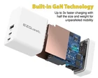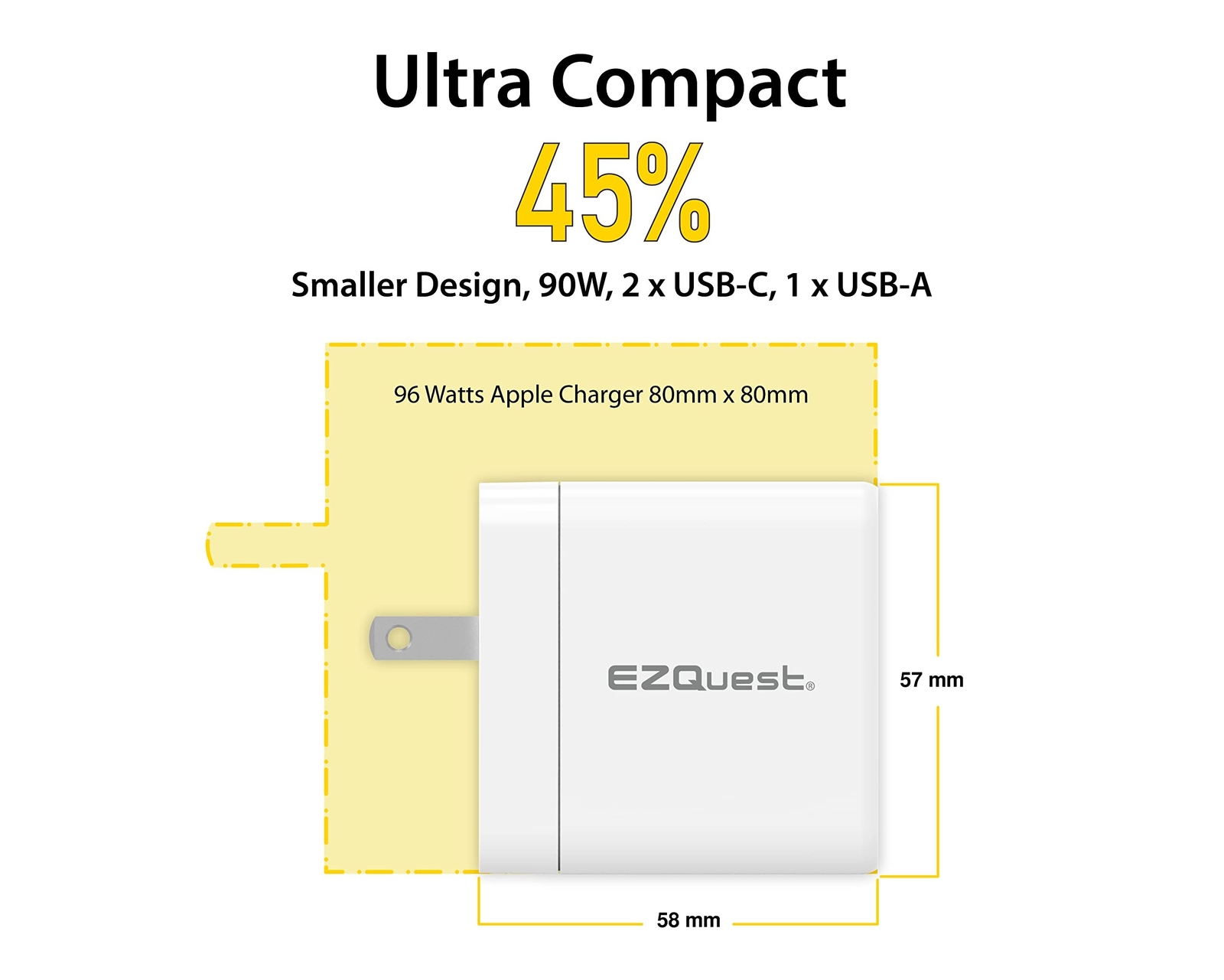 EZQuest 90W USB C Charger - 2X USB-C, 1X USB-A Port, with 2 Meter USB C Charger Cable - Fast Charging Block PD - GAN Charger Wall - EU Converter Compatible for MacBook Pro & Other Type C Devices Product Details Style: 90W Brand: EZQuest MPN: X50090 UPC: 694307500907 EAN: 0694307500907 Brand: EZQuest Connectivity Technology: USB Connector Type: USB Type C Compatible Devices: Laptops Compatible Phone Models: Huawei P10, Google Nexus 5X, Huawei Mate 20 X, Google Pixel, Apple iPhone XS, Huawei Mate 20 Pro, Google Pixel 3 XL, Samsung Galaxy S10, Huawei Mate 9 See more Special Feature: short_circuit_protection, fast_charging, Fast Charger Fast Charging Lightweight, magnetic, travel Color: White Input Voltage: 110 Volts Mounting Type: Wall Mount Total USB Ports: 3 Package Dimensions: 8.94 x 5.35 x 1.85 inches Item Weight: 11.7 ounces Item model number: X50090 Date First Available: February 7, 2022 Manufacturer: EZQuest Country of Origin: China [UNLEASH THE POWER] Our USB-C charger is powered by Gallium Nitride (GaN) Technology and is 2X Smaller than Traditional Silicon-Based Chargers. Designed with your on-the-go lifestyle in mind, our fast charger is compact and lightweight, our fast charging block comes with Quick Charging Ports and High-Power Efficiency you will be ready to accompany all your adventures. [ENHANCED CHARGING PROTECTION AND COOLING] Our USB C wall charger has Built-in NTC (Negative Temperature Coefficient) Technology that keeps the USB C charger block Cool which prevents Industry-Leading Over-Current, Over-Voltage, Over-Temperature, and Short-Circuit Protection. Additionally, the charger is filled with Thermal Conductive Epoxy, copper heat-sink and EMI shielding which enables efficient heat dissipation to further enhance its reliability. [CHARGE EVERYTHING] This USB C fast charger 90W is capable of charging a single MacBook Pro 16-inch at 90 Watts or two at 60/30 Watts each simultaneously. You can also charge your iPad at 18 Watts when it is charged by itself. This charger supports QC4+, PD 3.0, QC3.0, QC2.0, PPS, AFC, Apple 2.4A, FCP, and SCP charging protocols. [FOLDABLE US WALL PLUGS] This USB-C charger comes with compact form factor, no messy cables, and optimized portability will make it perfect for traveling worldwide with universal 100V - 240V voltage so you can charge in any country that uses a US or European plug with USBC charger. [18 MONTHS WORRY-FREE WARRANTY] This USB C charger cable fast charging block comes with unparalleled peace of mind & exclusive 18-month Worry-Free Warranty, designed to safeguard your investment. Our commitment to excellence extends beyond product quality. Our customer service team is dedicated to providing you with unparalleled support and assistance throughout your entire journey with us.