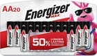 Energizer AA Batteries, Max Double A Battery Alkaline, 20 Count 20-pack of Energizer MAX alkaline AA batteries Up to 50% longer lasting than basic alkaline in demanding devices Leak resistant-construction protects your devices from leakage of fully used batteries for up to 2 years Bonus: It’s guaranteed Non-stop energy for your non-stop family’s must-have devices—think toys, flashlights, wireless mice, remotes, and more Holds power up to 10 years in storage—so you’re never left powerless Long lasting power and innovation is what the Energizer MAX family is all about Meet our longest-lasting AA and AAA Energizer MAX batteries yet They also hold their power for up to 10 years while in storage, so you have power when you need it most When it comes to toys, digital cameras, and other valuable devices, you can feel confident knowing you have the long-lasting power and protection you expect from Energizer 2.2 inches x 6.0 inches x 1.1 inches. Weight: 11.2 oz Item model number E91LP-20 Style AA Battery Cell Composition Alkaline Product Dimensions 6 x 2.2 x 1.1 inches Item Weight 11.2 ounces Batteries 20 AA batteries required. Recommended Uses For Product Camera,Digital,Remotes Number of Batteries 20 AA batteries required. Compatible Phone Models battery powered toys Is Discontinued By Manufacturer No Size 20 Count (Pack of 1)