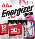 Energizer AA Batteries, Max Double a Battery Alkaline, 4 Count Fast Shipping! Product Description: 4 pack of Energizer MAX AA Alkaline Batteries, Batteries AA Size Energizer's longest-lasting MAX AA batteries provide dependable power - up to 50% longer lasting than EVEREADY GOLD in demanding devices The power you depend on for your double A devices, from toys and flashlights to everyday items like remotes These Energizer AA batteries hold power for up to 10 years in storage Energizer MAX AA batteries are designed to protect your devices against damaging leaks for up to two years after fully used Power the devices you love with Energizer MAX Alkaline AA Batteries. These Energizer batteries fuel the technology that helps you live, work and play, whether you need remote batteries, clock batteries, or backup batteries for your child's favorite toys and games. Energizer's No. 1 longest-lasting MAX, these double A batteries keep your favorite devices running longer. Powerseal Technology helps protect your devices against damaging leaks for up to two years after these AA Energizer MAX Batteries are fully used. With a shelf life of up to 10 years in storage, this AA battery pack is ready to keep your devices operating when you need them most. Depend on the power of Energizer MAX AA Batteries to power your everyday electronics. 31K POSITIVE REVIEWS!! FAST SHIPPING!!!! 100% AUTHENTIC PRODUCT OR YOUR MONEY BACK GUARANTEE! 100% satisfied customers. It says it all. Thank you for shopping with us!