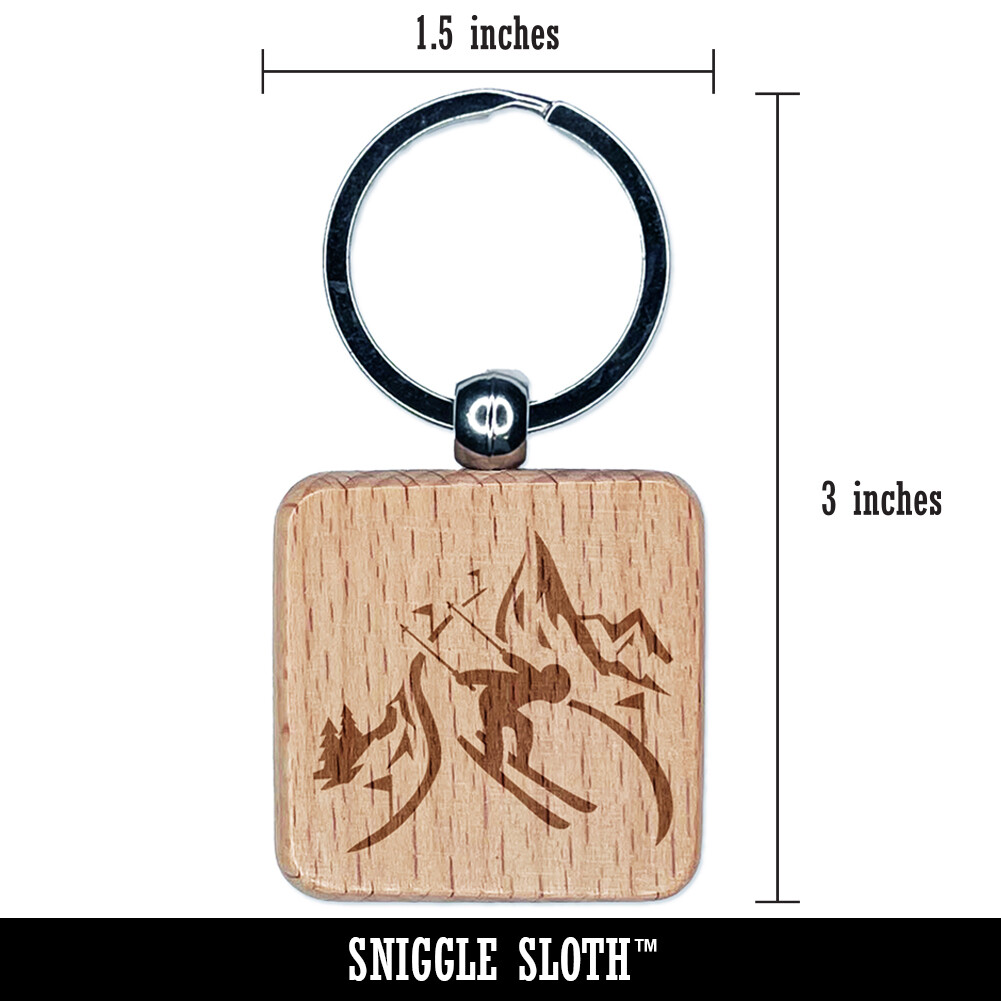 Engraved Wooden Skiing Keychain with Skier on Mountain Slopes