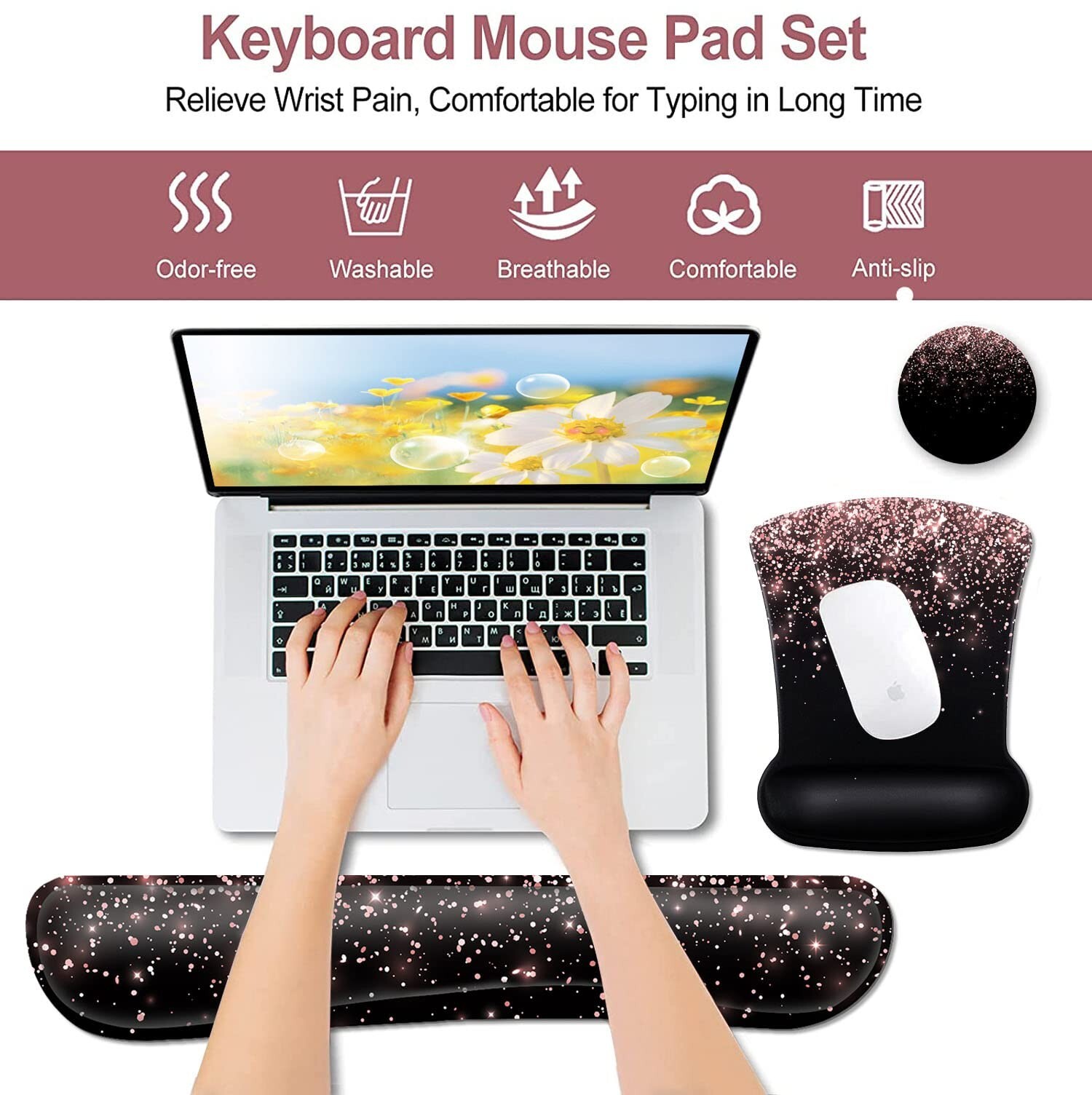 Mouse Pad with Wrist Support, Ergonomic Gel Mouse Pad, Soft Memory Foam Keyboard Wrist Rest, Suitable for Office Typing, Games, Beautiful Rose Gold Glitter Pattern and Black Mouse Pad, Dirt-Resistant ✓ Free 60 Day Returns ✓ Free Express Shipping Description: Features: Gel PadFilled with excellent cooling gel. Soft and comfortable gel padded pad. When your hand leaves it, it will slowly rebound without deformation. This wrist protector mouse pad is ergonomically designed to protect your wrist joints, reduce wrist fatigue and provide maximum comfort and support for your wrist. Lycra CoveringThe smooth Lycra covering improves tracking movements and creates consistent gliding.Tested by the top mousesensor manufacturer, the high thread count and smooth surface optimizes mouse tracking accuracy for both optical and laser sensors. Non-Slip Rubber BaseHigh-quality non-slip rubber base, the back of the mouse pad can firmly grasp the desktop, compared with the normal mouse pad, the friction resistance is increased by 99%, it can prevent any accidental movement of the mouse pad while typing. And the reinforced edge can effectively prevent damage and deformation, guarantee long-term use, provide you with stable operation, and let you move your mouse freely without worrying about the mouse pad slipping away. Eco-friendly and easy to cleanMade of eco-friendly materials, with ROHS certificate to ensure safety. No toxic and chemical odors. High quality printing process, durable, colorfast, wrinkle free, easy to clean and keep clean.You only need give it a quick and soft wipe with a damp cloth and they'll be fine. After-sale warrantyThis is a keyboard wrist rest and wrist mouse pad combination, and considerately give you a free coaster.If you are not satisfied with the product or have quality problems, please contact us for a full refund or free replacement (no returns required). Product Details: Brand: JVGFYNKL Color: JV-mouse pad-45 Special Feature: Ergonomic Recommended Uses For Product: Office Material: Memory Foam Brand: JVGFYNKL Item model number: JV-mouse pad-45 Item Weight: 6 ounces Product Dimensions: 17.28 x 7.3 x 0.89 inches Item Dimensions LxWxH: 17.28 x 7.3 x 0.89 inches Color: JV-mouse pad-45 Manufacturer: JVGFYNKL Date First Available: May 13, 2022