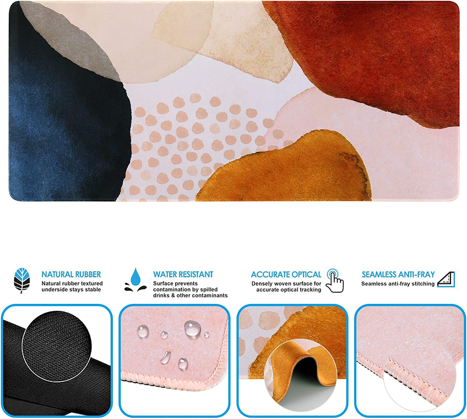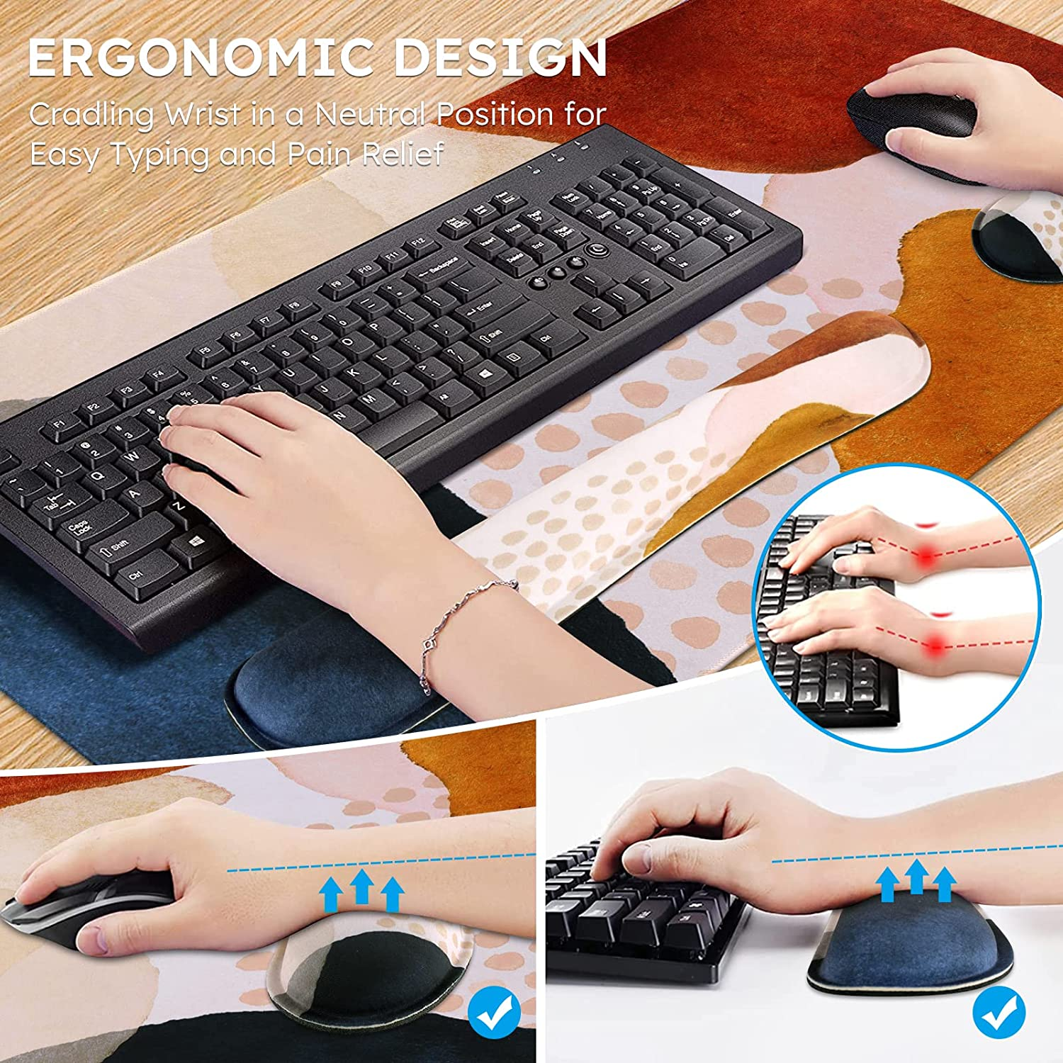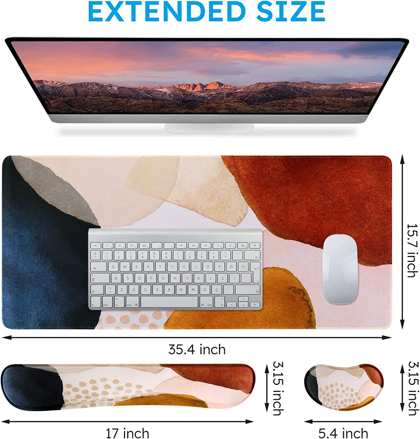 Large and Extended Size: XXL large mouse pad.Gaming mouse pad which is large enough to fit a full-sized keyboard and mouse, providing plenty of space for professional gaming or office work, Keep a clean, uncluttered desk Wrist Rest for Computer Keyboard and Mouse: With Comfortable Memory Foam & Breathable Material to the pads. The fabric of the surface is super soft. Slow bounces back and are not easy to out of shape provides comfortable and elastic support to the wrist Ultra-smooth Surface or Non-slip Rubber Base: It can provide optimum speed and accurate control during your working or gaming.0.10 in (3 mm) thickness at such an expansive size provides the stability you need for both mouse and keyboard Water Resistant Coating: A spill-proof coating makes liquids slide right off the surface. Effectively prevent damage from spilled drinks or other accidents.You can easily clean any dirt with a damp cloth Stitched Edges:Gaming mousepad has delicate edges which can prevent wear, deformation and degumming in prolonged use. And the edge even the seams at the edge are flat iCasso gaming mouse pad+keyboard wrist rest+mouse wrist support pad, 3 in 1 union enhance your gaming/working experience. Feature: - Ergonomic shape and just the right height keep your wrist in a natural position rather than a twisted angle. -Non-slip textured bottom with the natural rubber material to prevent gliding or unnecessary movement. -Memory foam structure, comfortable lightweight, with no deformation. Adopt soft and breathable materials to provide lasting support for your wrist. -The sizes of keyboard wrist pad and mouse wrist pad fits most computers or notebooks. It is also helpful to avoid joint and wrist problems. Package Include: 1 x Extended Mouse Pad 1 x Keyboard Wrist Rest Pad 1 x Mouse Wrist Rest Pad Specifications: Material: Lycra Fabric + Memory Foam + Rubber (Bottom Base) Keyboard Wrist Rest Dimension: 17 x 3.15 x 1.2 inch Mouse Wrist Rest Dimension: 5.4 x 3.15 x 1.2 inch Mouse Pad Dimension: 35.4 x 15.7 x 0.1 inch 90 x 40 x 0.3 cm)