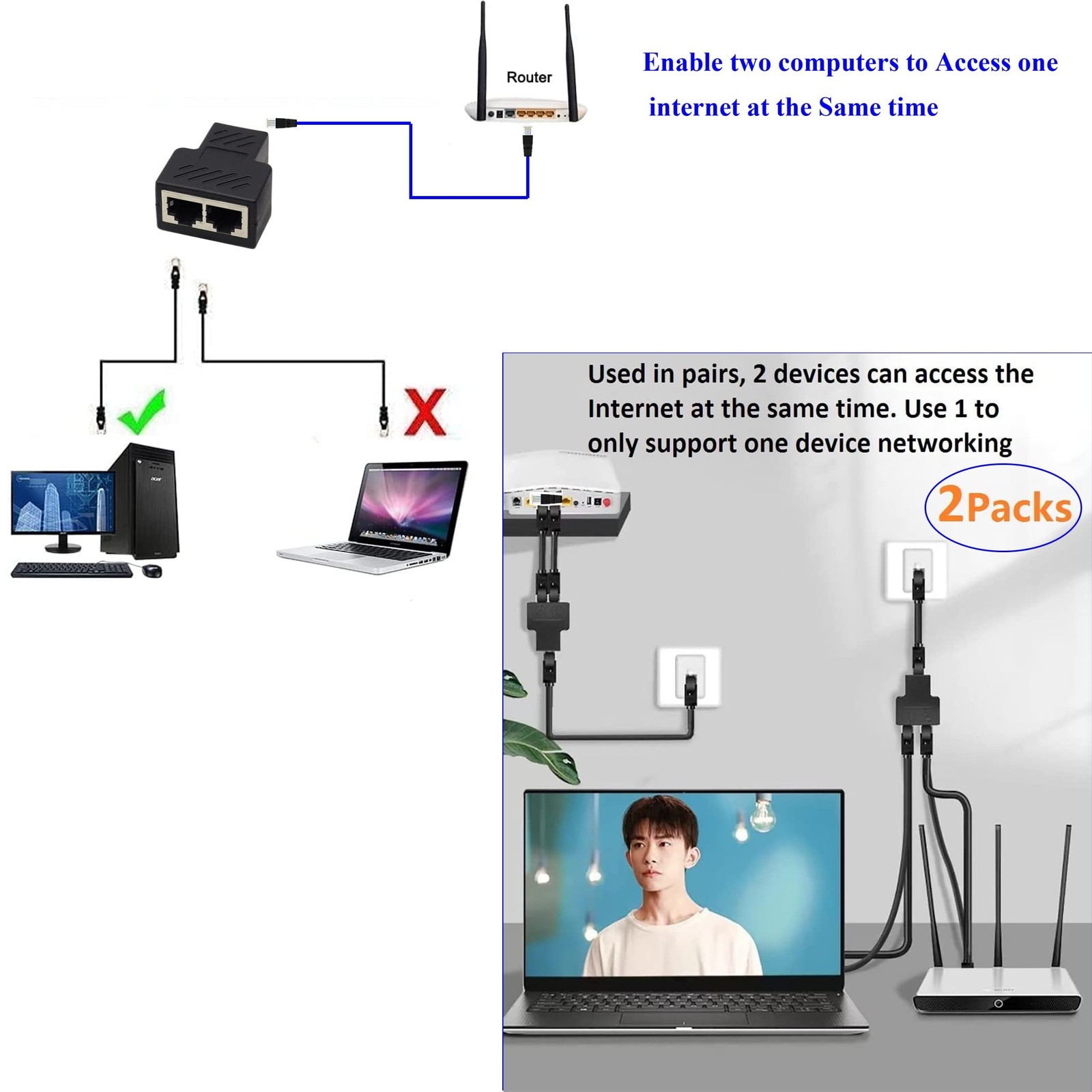 Ethernet Cable RJ45 Splitter Adapter 1 to 2 Double Contact Modular Plug Connect(Can't Run Both at The Same TIME) LAN Network Internet Splitter 1 to 2 for Cat 5/6/7 Cable(2 Pack) Product Details Brand: ZUYOOK Hardware Interface: Ethernet Color: black Compatible Devices: Laptop, Desktop, Router Data Link Protocol: Ethernet Data Transfer Rate: 10 32nds UPC Manufacturer: ZUYOOK Product Dimensions : 3 x 2 x 0.69 inches; 2.4 ounces Date First Available : May 20, 2022 Manufacturer : ZUYOOK Country of Origin : China Best Sellers Rank: #1,047 in Powerline Network Adapters Customer Reviews: 3.5 3.5 out of 5 stars 3 ratings Note: One Pair RJ45 splitters Must be used Together, Only one piece could not accomplish two devices with network at the same time. Easy to operate,save cost,configure and use. Eight Core Gold-plated Needle Core: Using gold pated needle core,Transmission signal is more stable.It is superior contact and transmission performance to ensure that the signal transmission. Metal Shield Both Solid,Fixed RJ45 interface,Shielding the outside world EML,RFI Such as electromagnetic interference, to prevent damage, to the lack of network signals. This RJ45 Splitter Connectors Coupler Convert And Increase Your reticle connection from 1 To 2 sockets,then you can use your computer or laptop in two room or place. it can easy to deal with the connect problem when your cable is too short ,This is not router,the two device can't surf the Internet at the same time! This is just a splitter Note: One Pair RJ45 splitters Must be used Together, Only one piece could not accomplish two devices with network at the same time. Easy to operate,save cost,configure and use. This rj45 network splitter adapter is not the same as a network router or network adapter, it doesn't have the function of the assign IP addresses. Three Connection Ways: 1. Two computers to share one Ethernet line AT SAME TIME 2. Routers and set-top box can be simultaneously networked 3. Make use of routers to loop the signal to other devices. This rj45 splitter adapter is mainly used to solve the connection problem caused by insufficient wiring, and it can make two devices surf the Internet at the same time by means of the physical tapping method. Note: (Two Female Port Workable Simultaneously) The rj45 ethernet splitter 1 to 2 adapter divide original embedded Ethernet cables (8pins) into two groups (1234/5678). Two groups respectively transmit data with purely physical connection which don't have the function of the assign IP addresses. RJ45 Network Adapter Connection method: if two computer need internet stimultanously, so when the router away from the computer, only need one 8 core cable in the middle of two rj45 splitter, but you need two computer at the same time, please using this method, as picture 4 instruction. Note: Installing and using this pair of adapters, pay attention to the port, port 1 corresponds to port 1 , port 2 to port 2, can't be reversed.