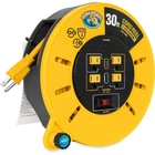 Etokfoks 30ft. Cord 16/3 Gauge, 10Amp Extension Cord Reel with 4- Outlets and 2-USB Ports Cord Color: Yellow Cord Designation: SJT Cord Filling: Solid Filled Cord Included : Yes Cord Length (ft.): 30 ft Durability: Not Applicable Features : Cord Included ,On/Off Switch,Overload Protection,Retractable,USB Port Gauge: 16 Indoor/Outdoor: Indoor/Outdoor Jacket Material : Acrylonitrile-Butadiene-Styrene Copolymer (ABS) Maximum Amperage (A): 10 A Maximum Wattage: 1250 Minimum Temperature (F): 0 F Number of Conductors: 3 Number of Outlets: 4 Plug Configuration: 5-15 Plug Housing Material : PVC Receptacle Configuration: 5-15 Returnable : 30-Day Voltage (V): 125 V Weight (lb.): 5 lb Cord Thickness (in.): 0.25 in Product Height (in.): 4 in Product Width (in.): 10 in Wire Gauge: 16 Introducing the Camco Power Grip 30-Foot Extension Cord Reel with USB Charging Ports - the compact solution for versatile power access and organization. With its extended length, this 10-amp extension cord reel, featuring 16/3-gauge wire for superior conductivity, allows you to effortlessly power your equipment while keeping your space organized and ready for action. Equipped with (4) 125V electrical outlets, (2) USB ports (2.1A shared), an on/off switch, and a built-in circuit breaker, this cord reel prioritizes safety and convenience for all your indoor power needs.