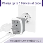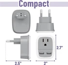 Package includes: 1 pack of US to EU travel plug adapter Features: - 3-in-1 Input: Compatible with standard N American 2 and/or 3 prong flat pin plugs, and includes 2 USB ports - Compatible in most European countries: Works in France, Germany, Italy, Greece, Iceland, Switzerland, Austria, Spain, Denmark, as well as Israel, South Korea, India (NOT COMPATIBLE IN UK) - Small, Compact, and Lightweight: Perfect for travel, fits securely to your devices and won't fall out - Multi-purpose Usage: Quality electric adapter plugs can be used to charge smartphones, power banks, Bluetooth speakers, laptops, tablets, and more (THIS PRODUCT DOES NOT CONVERT VOLTAGE FROM 110 TO 220 OR VICE VERSA)