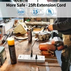 Extension Cord 25 Ft, NTONPOWER Long Surge Protector Power Strip with 12 Outlet 3 USB, 2100 Joules, 1875W/15A, Overload Protection, Flat Plug, Wall Mount for Home Office, Workbench, Garage, White Product Details Size: 25FT Brand: NTONPOWER MPN: LS-12A3U-US EAN: 6936761810562 UPC: Does not apply Brand: NTONPOWER Color: White-12 AC Total Power Outlets: 15 Voltage: 125 Volts Special Feature: On And Off Switch, Surge Protection 2100J, 25 ft extension cord, Usb Slot Product Dimensions: 12.2 x 3.35 x 1.2 inches Item Weight: 2.13 pounds Item model number: LS-12A3U-US Date First Available: October 9, 2020 Manufacturer: NTONPOWER Technology Co.,Ltd Country of Origin: China 25 ft Extension Cord Flat Plug extension cord 20 ft provides extra cord length and gives you the flexibility to reach distant outlets and the place where is hard to reach. White power strip long cord is made of 14 AWG pure copper, which has better current carrying capacity (15A). Power strip flat plug eliminates awkward cords from cluttering indoor decor. Fits easily into hard-to-reach outlets tucked away behind your bed or sofa and keeps your other wall outlets unblock. Ultra High Surge Protector & Overload Protectionextension cord 25 ft long power strips with surge protection built-in rated 2100Joules surge suppression protection to safeguard computers, appliances, home theater and office equipment from lighting, surges or spikes. Reliable 15A Overload Protector switch(built-in circuit breaker) will trip off automatically to protect your expensive devices and your home. Environmental protection and fire-resistance PC shell with flame retardant at 1382F makes it more durable and longer lifetime. Widely Spaced AC Outlets & Wall Mount Optionsextra long power strip has 2 wide spaced AC outlets can accommodate slightly larger power adapters without blocking adjacent outlets. Two mounting holes easily allow wall mount power bar to be securely installed in various applications, such as workbenches, floor mounts, wall mounts, under counters, dorm room, garage and more. It can mounted vertically or horizontally. 12 Outlet 3 USB Ports for Anyuse long extension cord with multiple outlets 12 outlets and 3 USB ports in an outlet flat plug power strip which allow you to charge multiple devices at the same time. 3 power usb ports provide 5V/2.4A max charging current in one port and total 3A/15W output, whcich can save up to 1 hour than standard USB ports. And would suitable for most cellphone, laptop, tablet, cameras without a variety of converters. Save your space and make your desktop organized. Multiple Protection 3 prong extension cord is made of high strength fire-resistance ABS+PC shell, making it fireproof up to 1382 F. High-end solid capacitors ensure complete protection against electrical short circuit, over heat, over charging, over current and over voltage danger. Certificated by FCC & ETL