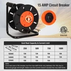 Portable extension cord storage reel: Designed to hold up to 100 ft of 16/3, 14/3, or 75 ft of 12/3 gauge power cord; ideal for homes, backyards, garages, or workshops; features a sturdy metal carrying handle for enhanced efficiency; suitable for dry-location use 15 AMP circuit breaker for safety: Equipped with a 15 AMP circuit breaker and reset switch; protects against damage from excess current; note: maximum amp limits depend on the gauge of the extension cord (10A to 15A); refer to the manual's current limit diagram for guidance Tangle-free smooth operation: Ergonomic design with a rugged open reel; stable steel metal base; easy-grip handle and side-mounted hand crank knob for quick winding and unwinding; multifunctional cable management clip locks the cord at the desired length; ideal for an extension cord storage reel Multiple grounded power outlets: Features four grounded power outlets; allows simultaneous use of multiple tools; convenient On/Off switch with LED indicator eliminates the need to unplug during breaks; indicates power status for safe operation Sturdy, durable, and portable design: Heavy-duty electrical cord wheel; impact-resistant polypropylene open drum design; rigid metal carrying handle and durable steel base ensure portability and durability; perfect for bringing power where you need it with this extension cord storage reel ETL Certified for Enhanced Safety