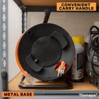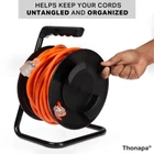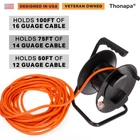 Extension Cord Storage Reel, Black - Portable Cable Reel with Metal Stand, Holds Up to 100 Ft of Electrical Cord, Hose, Rope Product Details Brand: Thonapa Material: Metal Color: Black Item dimensions L x W x H: 10 x 7.5 x 13.7 inches Style: Portable,Heavy Duty Brand: Thonapa Material: Metal Color: Black Item dimensions L x W x H: 10 x 7.5 x 13.7 inches Style: Portable,Heavy Duty Item Weight: 2.5 Pounds Installation Type: Freestanding Operation Mode: Manual Manufacturer: Thonapa Capacity: 1E+2 Feet UPC: 840013428671 Part Number: TH-CSR-WS-BK Item Weight: 2.5 pounds Product Dimensions: 10 x 7.5 x 13.7 inches Country of Origin: China Item model number: TH-CSR-WS-BK Batteries Included?: No Batteries Required?: No Date First Available: July 2, 2000 KEEP YOUR CORDS TANGLE-FREE - This power cord reel keeps your cords organized and ready for action. No more hassling with extension cord knots or tangles! HOLDS UP TO 100 FEET - Holds 100 feet of 16 gauge cable, 75 feet of 14 gauge cable, or 50 feet of 12 gauge cable. DURABLE DESIGN - Constructed from heavy duty metal with a strong durable design, this extension cord reel 100 ft is bullet to last! CARRY HANDLE - Convenient carry handle for quick and easy transportation. BUILT FOR RUGGED INDOOR & OUTDOOR USE - Ideal electric cord reel for use in garages, barns, back yards and more!