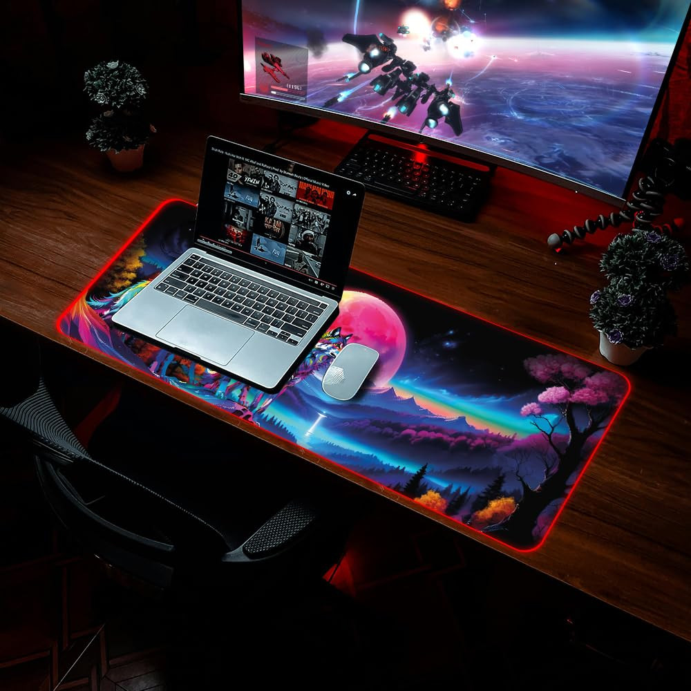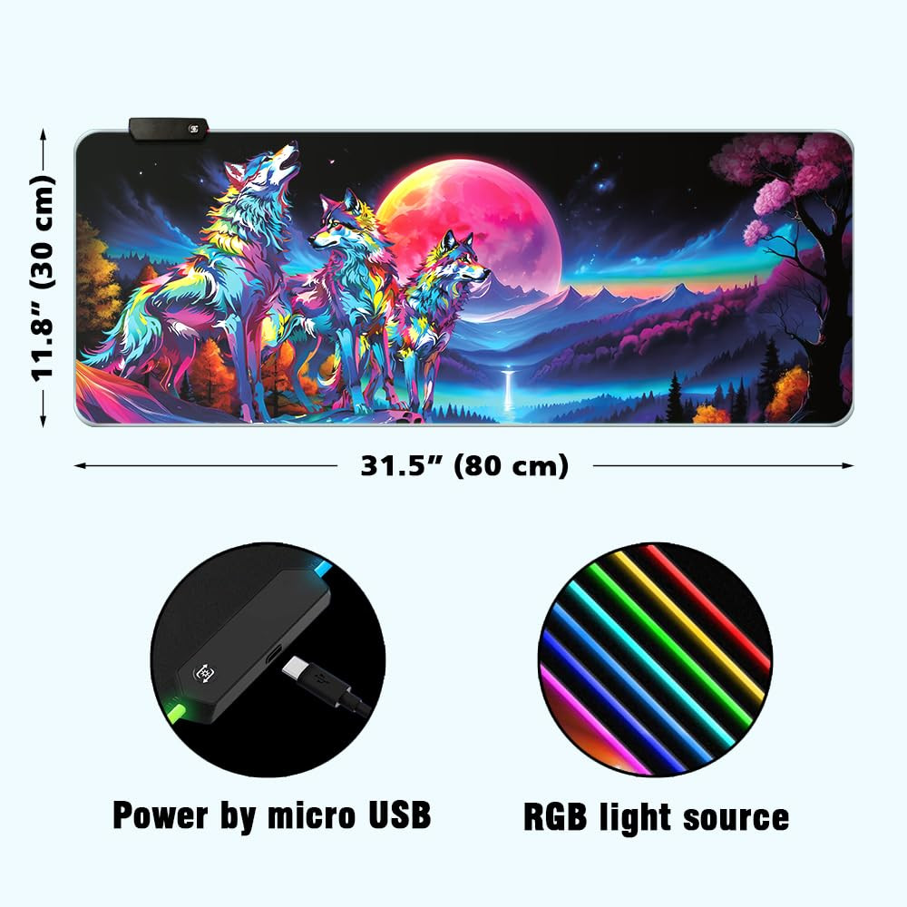 PREMIUM MATERIAL: Our fashionable RGB gaming mouse pad with a non-slip rubber base and a great RGB lighting mode is made of high-quality eco-friendly rubber and fabric materials which are soft, smooth, waterproof, durable and perfect for your gaming experience. SIZE: This stylish gaming mouse mat measures about 31.5 x 11.8 inches (80 x 30 cm), which can cover the area for a full-sized keyboard and mouse to provide plenty of room for professional gaming or office work. RGB LIGHTING MODES: With the RGB lighting design in the four sides of the mouse mat, this gives you stunning visual effects and creates an immersive game environment. You can also set the perfect mood for your game and easily switch 14 lighting moods by one button. ANTI-SLIP RUBBER BASE: The thick natural rubber base is non-slip and easy to move and firmly grip your desk, even glass surface, which allows you to enjoy the ultimate precision in the games you are most passionate about. STYLISH DESIGNS: Designed with nice colors and unique stylish prints, our quality RGB gaming mouse pads surely provide you with stunning visual effects and a great gaming experience. A range of beautiful fashionable patterns are available for your choice.