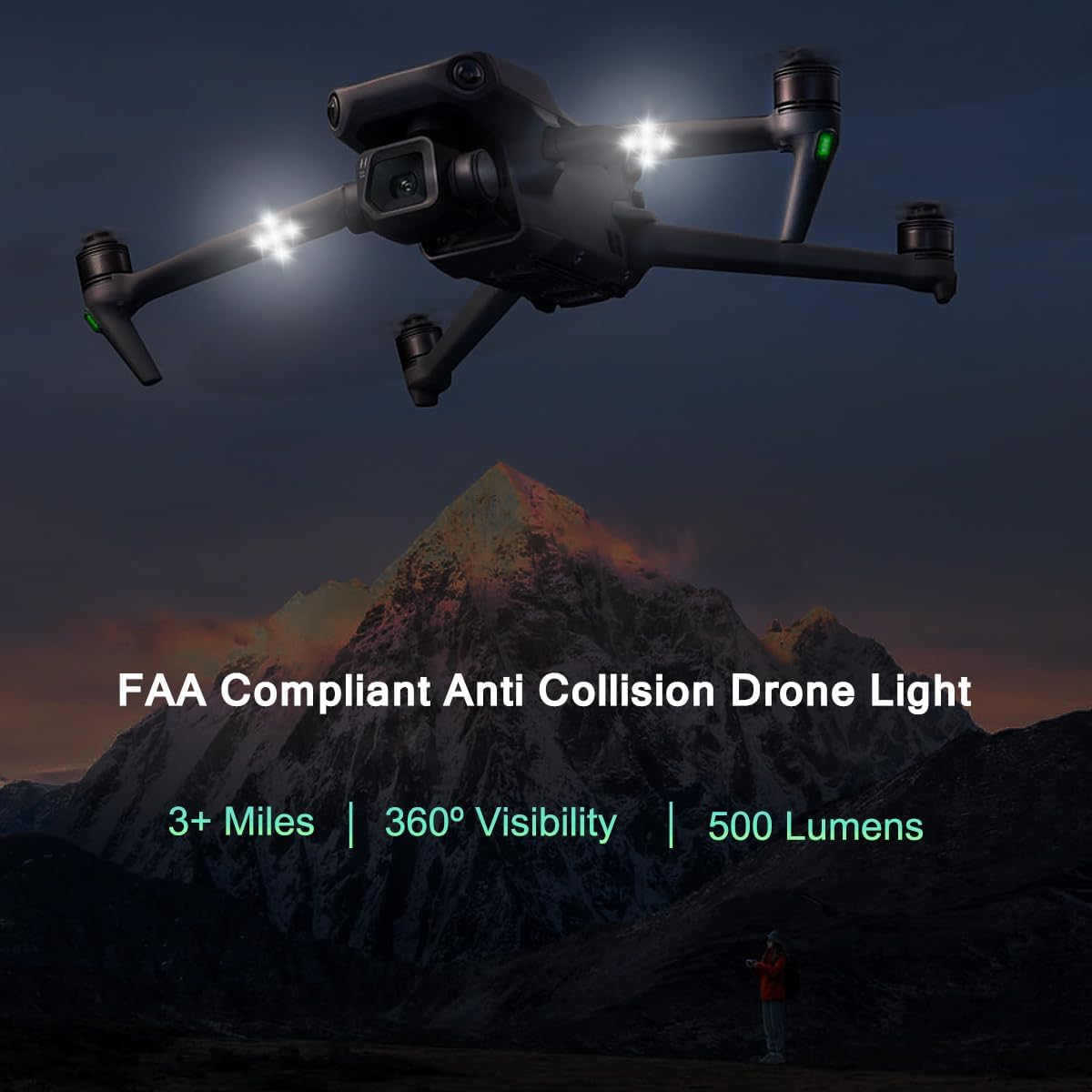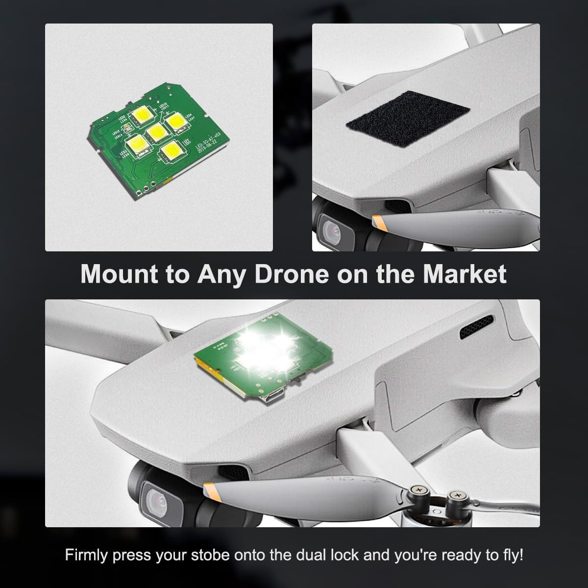 Super Brand : 5 pcs Leds from USA brand Cree, which is much better than our competitors' strobe made from cheap Chinese leds. Super Bright: 500 Lumens. 5 Times Brighter than our competitor. 3+ Miles visibility that meets the night flying. Super Easy Installation: Fully self contained. 3M tape mounted, easily install and removed without hurting the surface. Super Light-weight: Weighs only 6 grams. Perfect for minimizing weight on flying. Long Last Time: Built-in high qulity battery provides run-time up to 3 hours. Comes with power indicators lights and overcharge protection. Fits All Drones like DJI Mini 3 Pro/Mini 4 Pro/Mini 2/Mini SE/Air 3/Air 2S/Mavic 3/Mavic 2 Product Description FAA Compliant Anti-Collision Lighting Visible from 3+ Miles Away The Strobe's 3+ mile visibility allows you to keep your drone within line-of-site and allows nearby aircraft to detect your UAV from a safe distance. 360º Visibility The Strobe's dome-like design allows you or nearby aircraft to detect the strobe from 360º Micro-USB Rechargeable Easily recharge your Strobe using the Micro USB recharge port and the included charging cable. Recharge time takes about 60 minutes. 3M Dual Lock Mounting Mount your Strobe to ANY drone on the market using 3M Dual Lock Technology. 3M is stronger and more durable than velcro, allowing your Strobe to be securely mounted to your Drone, no matter how hard you are flying! Size and Weight The Strobe weighs in at 6 grams and stands 1.2" tall leaving little to no impact on your drone's flight. What's Included Strobe LED Dual Lock Mount Micro USB Charging Cable
