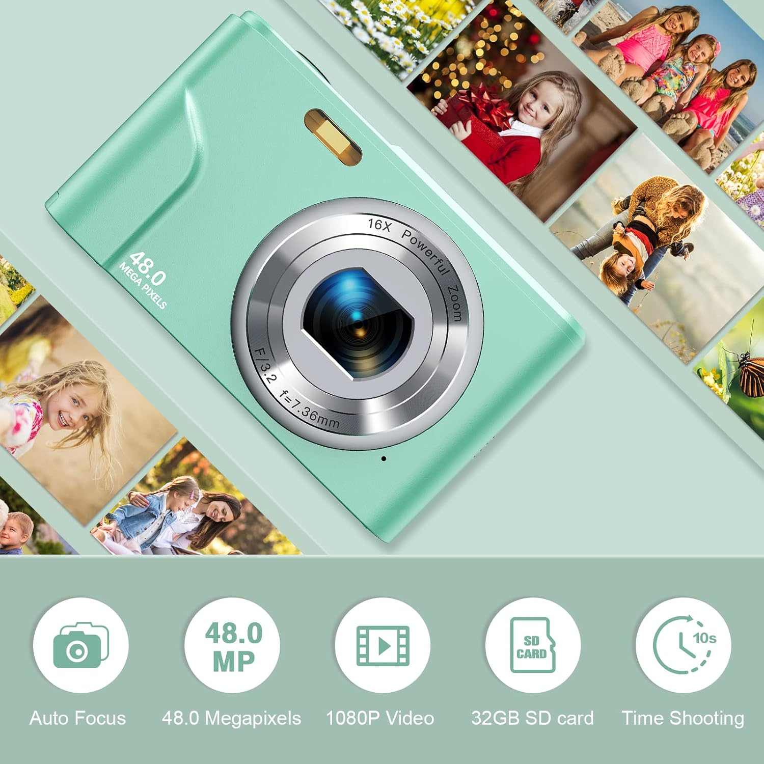 Store New Arrivals Add to Favorite View Feedback Contact Digital Camera Auto Focus Point and Shoot Camera, FHD 1080P 48MP Kids Camera with 32GB Memory Card,16X Zoom Vlogging Camera Small Digital Cameras for Kids Teenagers Students Green Description Display Resolution Maximum 48 MP Digital Scene Transition zoom Has Color Screen Yes Are Batteries Included Yes Age Range Description Kid Dots Per Screen 210000 Memory Storage Capacity 32 GB Focus Type Auto Focus Focus Features Autofocus Auto Focus Technology Contrast Detection Warranty Type [LIKELY] Limited Is Electric Yes Movie Mode Yes Image stabilization Digital Photo Sensor Technology CMOS Maximum Aperture 2.8 Millimeters Processor Count 1 Autofocus Yes Photo Sensor Resolution 48 MP Photo Sensor Size 1/2.3-inch Has Image Stabilization Yes Minimum Shutter Speed 1 seconds Audio Recording No Autofocus Points 31 Effective Still Resolution 48 MP Sensor Type CMOS Media Speed 10 MB/s Flash Memory Type SD Video Capture Format MP4 Maximum Webcam Image Resolution 48 MP JPEG Quality Level Normal Model Number Digital Camera Auto Focus Lens Type Wide Angle Exposure Control [Program (P) mode, Aperture Priority (Av or A) mode, Shutter Priority (Tv or S) mode, Manual (M) mode] Crop Factor 2.0 Skill Level Amateur, Professional Shooting Modes Automatic, Shutter Priority Battery Type Lithium Ion Mount Type Micro Four Thirds Screen Size 2.5 Inches Flash Modes Auto, On/Fill, Off, Slow Sync Aperture modes F2.8 Digital Zoom 16 x Supported Image Format JPEG File Format JPEG Total USB Ports 1 Image Capture Type Stills & Video Total Still Resolution 48 MP Digital-Still Yes Compatible Mountings Micro Four Thirds Zoom Digital Zoom Number of Component Outputs 1 Focal Length Description 2.8 millimeters Battery Average Life 3 Hours Shutter Type Rolling Shutter Connectivity Technology USB Flash Memory Speed Class 1 Viewfinder Optical Special Feature Image Stabilization Min Shutter Speed 1 seconds Supported File Format JPEG Display Type LCD Focus Mode Continuous-Servo AF (AF-C) Frame Rate 30 FPS Color Green Video Resolution 1080p Flash Memory Installed Size 32 GB Flash Memory UHS Speed Class U1 Compatible Devices [PARTIAL] Micro Four Thirds devices, devices with optical viewfinders, image stabilization technology, JPEG/MP4 file format support, Lithium Ion batteries, and LCD screens Maximum Image Size 48 MP Specific Uses For Product Children Photography, Vlogging White Balance Settings Auto Image Stabilization Digital Expanded ISO Maximum 25600 Built-In Media Camera Body & Accessories Flash Memory Supported Size Maximum 32 GB Aspect Ratio 4:3 External-Memory Size 32 GB Camera Lens The camera lens has a 2.8 millimeter focal length and supports 16X digital zoom, designed for kids and starters to take clear photos and videos with the help of auto focus and a professional CMOS image sensor. Continuous Shooting 30 fps 【1080P 48MP & Auto Focus】This digital camera has a professional level CMOS image sensor, which will take much clear 1080P videos and crystal 48MP pictures that is good enough to lead your kids to the photography world. Besides, the camera supports auto focus to avoid defocus and blurry images, friendly for starters and amateurs. 【More Funny Camera Function】The point and shoot digital camera supports essential photography functions 16X zoom, white balance, Anti-shake,continuous shooting, selfie, 16 pcs effects, ect. The children can take more creative pictures and record every exciting moment. Just open the switch key to enjoy the fun of taking photos. 【Large Screen & 16X Zoom】Designed for kids and starters, we adapted a 2.5 inch IPS screen, it provides larger viewing and more realistic colors for a better picture, and also a good protection for your eyes. With 16X digital zoom, the objects will be magnified up to 16x, an amazing tiny world shows on the screen. 【Easy to Operate & Long Working Time】This camera for kids updated chips and simplified the system, One-key to set the video and photo mode, and easy to choose various functions. Comes with two rechargeable batteries, the digital camera provides over 3 hours constant use, never worrying about power. 【Ideal Gifts & Reliable Customer Service】 This compact camera is lightweight and durable, perfect for birthdays, christmas, festival gifts for teenagers, children, and students. It's firmly placed in a custom box, accessories include a 32 GB SD card, USB cable, Charger, 2* 700ml Batteries, Lanyard and a small drawstring bag, One year Warranty. ABOUT US We offer the best prices around on high quality products. Our E-store includes media such as books, movies, music and games while offering electronics, toys, sporting apparel, clothing, tools, general home, garden items and more. SHIPPING We are always working hard to ensure your package arrives as soon as possible. Please understand that some factors like weather, high postal traffic, and the performance of shipping companies are outside of our control. We offer free shipping to the lower 48 states and ship within 2 business days of payment, usually sooner. We do not accept P.O. Boxes. Please provide a physical address. For shipping outside of the continental USA, we only use eBay's Global Shipping Program.The item is shipped to KY and then sent to the rest of the world. International customers are responsible for all duties and taxes. Continue to check out in order to calculate costs for shipping the item to your country. Messages regarding eBay's Global Shipping Program MUST be directed at eBay EXCLUSIVELY. RETURNS We offer a 30-Day Return Policy on items which you are not completely satisfied with. You have the option for a full-refund or an exchange of the item. No returns are available on items shipped outside of the USA. PAYMENT We accept PayPal. CONTACT US This page content is yet to come Please ad us to your favorite seller and visit again later Thank You CUSTOMER SATISFACTION We try our very best to make sure every customer is completel
