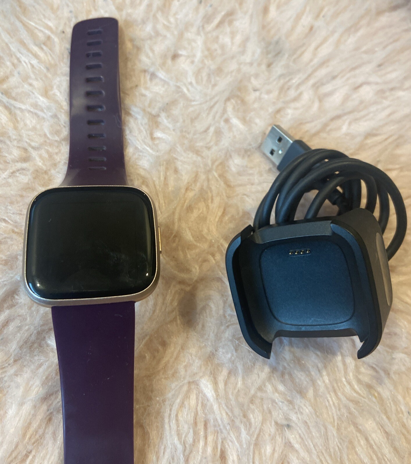 Tested working Fitbit Versa 2 - rose gold with purple band. Comes with OEM charger - buyer will need the Fitbit app to add. Ships with usps mail