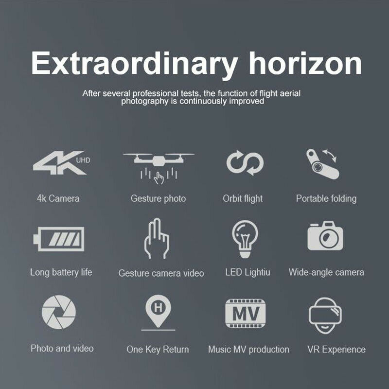 Description: Item NO.: E59 Frequency: 2.4G Channel: 6CH Motor: Brush Motor Quadcopter Battery: 3.7V 600mAh Lipo (Included) Transmitter Battery: 3*1.5V AA Battery ( NOT Included ) Flying Time: about 15mins Charging Time: 120mins R/C Distance: 150m Color: Gray Camera : 2.4G WiFi 4K HD FOV: 120° Wide Angle Quad's Size: 25*17*5.5cm (the arms not folded) 12.5*8*5.3cm (the arms folded) Features: - With foldable arm, small size, easy to carry. - With 2.4G wifi function can be connected APP, APK system to take pictures/video, real-time transmission through the phone camera image - With altitude hold mode function provides stable flight. - With Headless Mode,no need to adjust the position of aircraft before flying . - With One key to return function makes it easily to find the way home. - One Key Takeoff /Landing. One press automatically taking off or landing, the drone will take off or go back to the position where it took off. - 2.4GHz Technology Adopted for Anti-Interference. - The quadcopter fuselage is made of high strength and resistant engineering plastics,lightweight and durable resistance. -Gesture photo/video. Adopting advanced recognition technology, the aircraft makes gestures towards the aircraft during the flight. The aircraft automatically takes pictures after recognizing the gestures, which is more convenient. -Orbit flight. Plan the flight path of the aircraft to focus on shooting Function: Surrounding Flight, Waypoint Flight, Altitude Hold Mode, Headless Mode, One Key Return, One Key Takeoff /Landing, WiFi FPV, Camera/Video, Gesture photo/video, Orbit flight Package Included: 1 x E59 RC Quadcopter 1 x Remote Control 3 x 3.7V 600mAh Lipo Battery 1 x USB Charging Cable 4 x Protection Cover 2 x Spare Blades 1 x Screwdriver 1 x User Manual