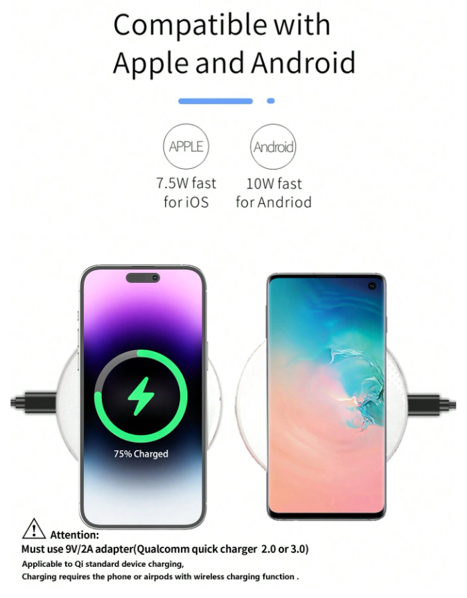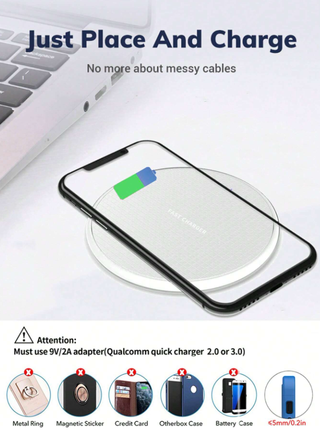 This wireless charger is a game-changer! Super sleek in white, it charges my Samsung phone and earbuds effortlessly. The 15W fast charging is quick and reliable, plus the non-slip surface keeps everything secure. The included cables make setup a breeze, and it works perfectly with my Qi-compatible devices. Compact, stylish, and highly functional—totally worth it!