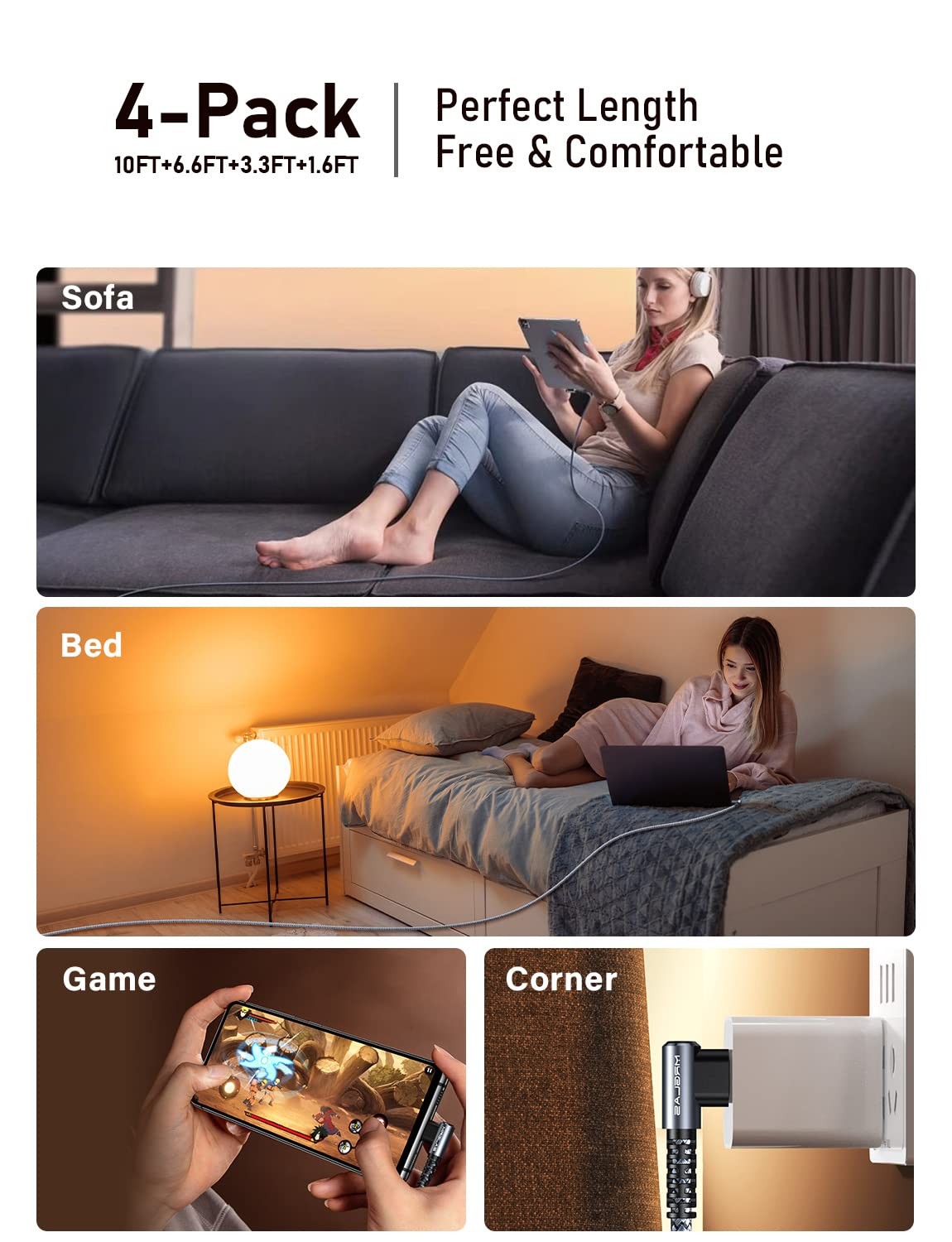 ❤️[Lifetime Promise] We’re so confident in our cables, we are offering a hassle-free replacement for all quality issues. Not for half a year, not for 18 months, but for an entire lifetime. It’s the only cable you will ever need to buy. We provide this 4-pack 3.2A premium nylon-braided usb c charger cable right angle (10+6.6+3.3+1.6ft). ⚡[Certified 3.2a Dual chip Fast Charging] 3.2A USB C fast charging cable is 2x faster than other cables with 3.1A, usb c cable with gold-plated design avoids energy loss than other cables, and it has a transfer speed of up to 480Mbps. With a data transfer rate of up to 480Mbps between two devices, this USB-C connection can download 100 songs every 5 seconds. 👑[Upgraded Exclusive Right Angle Design] USB A to USB C cable with an innovative 90 degrees " L " design. It can lessen stress on cords and your phone's USB-C port, effectively avoid the bending of the cord end and extend the life of the charging cable. It's user-friendly design more convenient and comfortable for playing games, watching videos, reading e-books when you charging. [Note: Compatible with all phone cases] 💎[Upgraded Gold-plated & Officially Certified] usb a to usb c cable with gold-plated design avoids energy loss than other cables,The gold-plated plug has rustless & anti-corrosion, the gold-plated cable service life 3x than others. This USB C charger fast charging cable has an gold-plated head that complies with the corresponding standards of electronic safety certification. 💎[Military-grade Nylon Braided Material] USB Type C Cable is joined with strong military nylon braided fiber, which is the most flexible, most robust, and most durable material in existence. which improves tensile force by 300% and features a unique stress relief support design that can endure 100,000+ bend tests 2-Year Promise: We’re so confident in our cables, we are responsible for all quality issues. It’s the only cable you will ever need to buy. We provide this 4-pack 3.2A premium nylon-braided usb c charger cable right angle (10+6.6+3.3+1.6ft). Certified 3.2a Dual chip Fast Charging: 3.2A USB C fast charging cable is 2x faster than other cables with 3.1A, usb c cable with gold-plated design avoids energy loss than other cables, and it has a transfer speed of up to 480Mbps. With a data transfer rate of up to 480Mbps between two devices, this USB-C connection can download 100 songs every 5 seconds. Upgraded Exclusive Right Angle Design: USB to USB C cable with an innovative 90 degrees " L " design. It can lessen stress on cords and your phone's USB-C port, effectively avoid the bending of the cord end and extend the life of the charging cable. It's user-friendly design more convenient and comfortable for playing games, watching videos, reading e-books when you charging. [Note: Compatible with all phone cases] Upgraded Gold-plated & Officially Certified: usb to usb c cable with gold-plated design avoids energy loss than other cables,The gold-plated plug has rustless & anti-corrosion, the gold-plated cable service life 3x than others. This USB C charger fast charging cable has an gold-plated head that complies with the corresponding standards of electronic safety certification. Military-grade Nylon Braided Material: USB Type C Cable is joined with strong military nylon braided fiber, which is the most flexible, most robust, and most durable material in existence. which improves tensile force by 300% and features a unique stress relief support design that can endure 100,000+ bend tests, It's durable enough to be used as a pull rope for cars,The flexible and durable double-braided nylon C charger cable fast charging lasts longer and never breaks.
