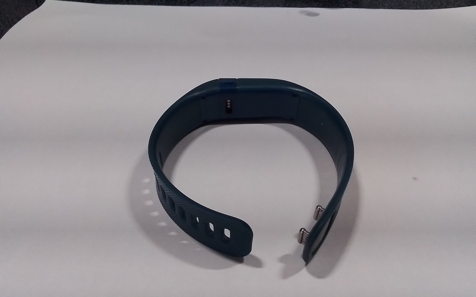 Doesn't have charger. The metal charge contacts on the back are in good condition. Cannot tell if it works because I don't have the charger. The watch band looks good there are a few scratches on it. The watch looks good a few light scrapes on the screen .overall it looks good.