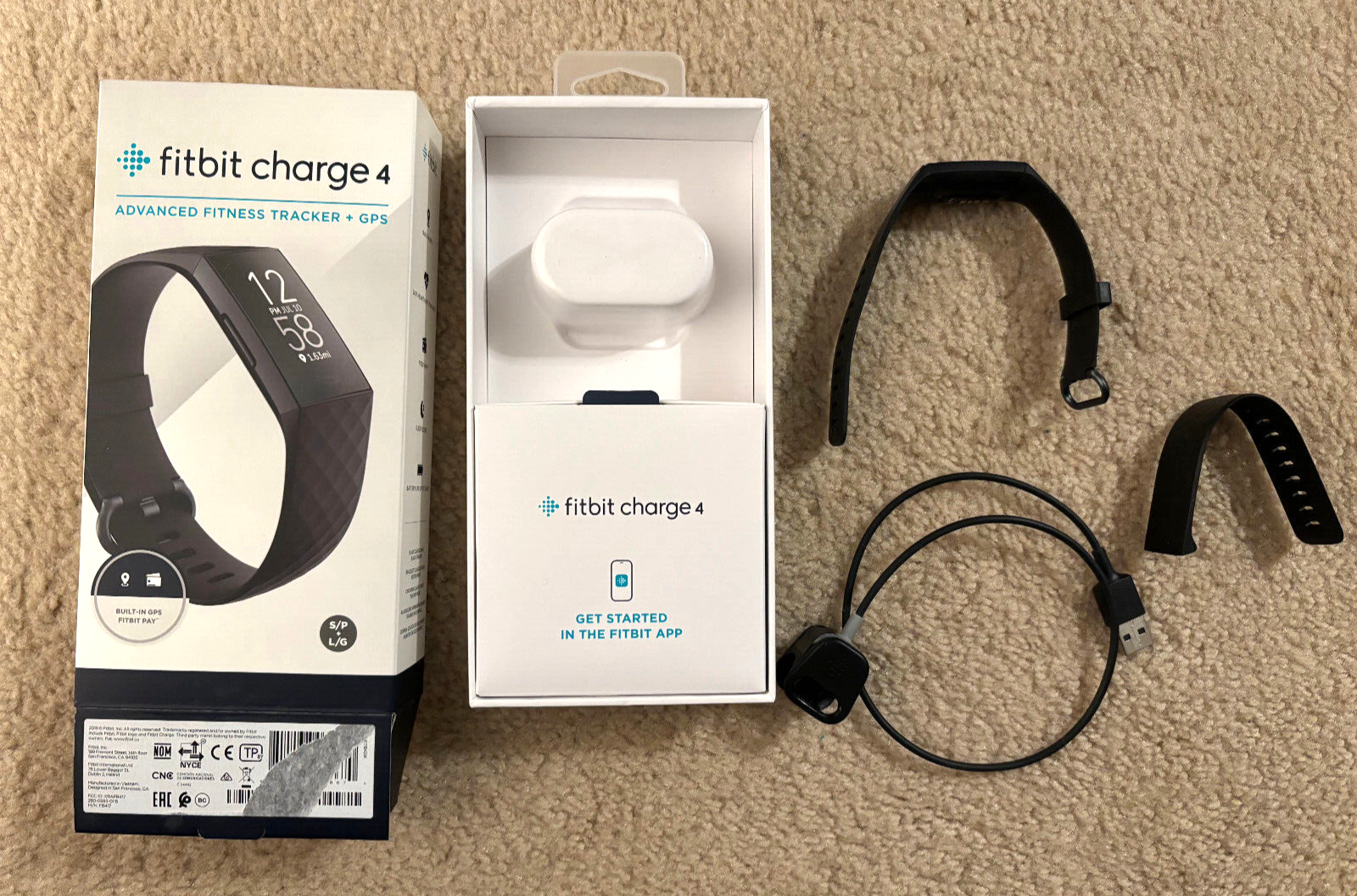 For sale is a black FitBit Charge 4 with original box. It comes with charger, larger wirstband accessory, and instruction book. It has been factory reset to factory settings.