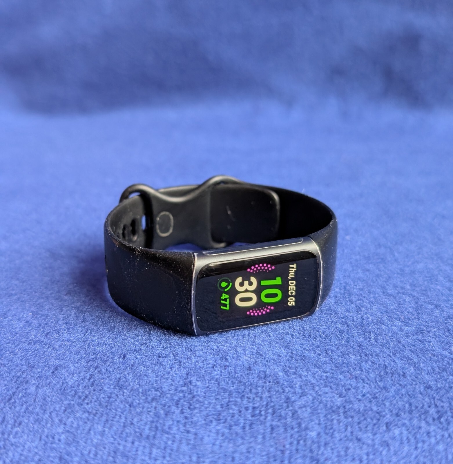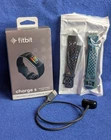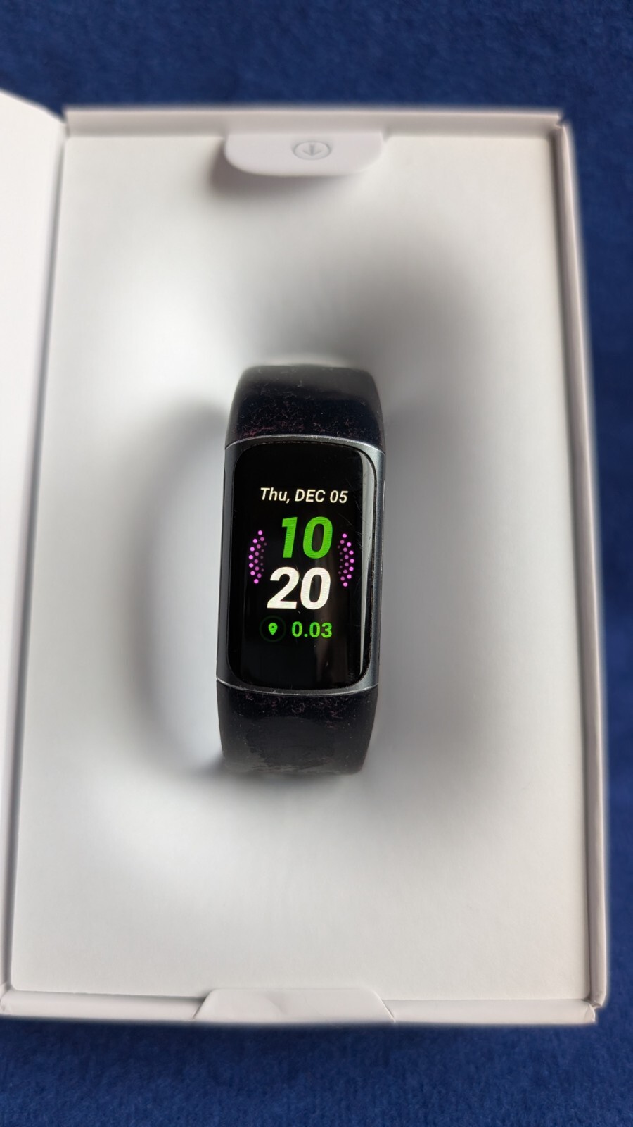 This set includes the Fitbit Charge 5, a power cord, one original band (large) unused, and a set of two new bands still in packaging. Fitbit Charge 5 has a variety of features including heart rate monitoring, calorie counting, and sleep tracking. It is designed to be used for indoor and outdoor activities and is suitable for gym and training, swimming, yoga, and running and jogging. It has a battery life of about 5-7 days. The Fitbit Charge 5 is black in color and is worn on the wrist.
