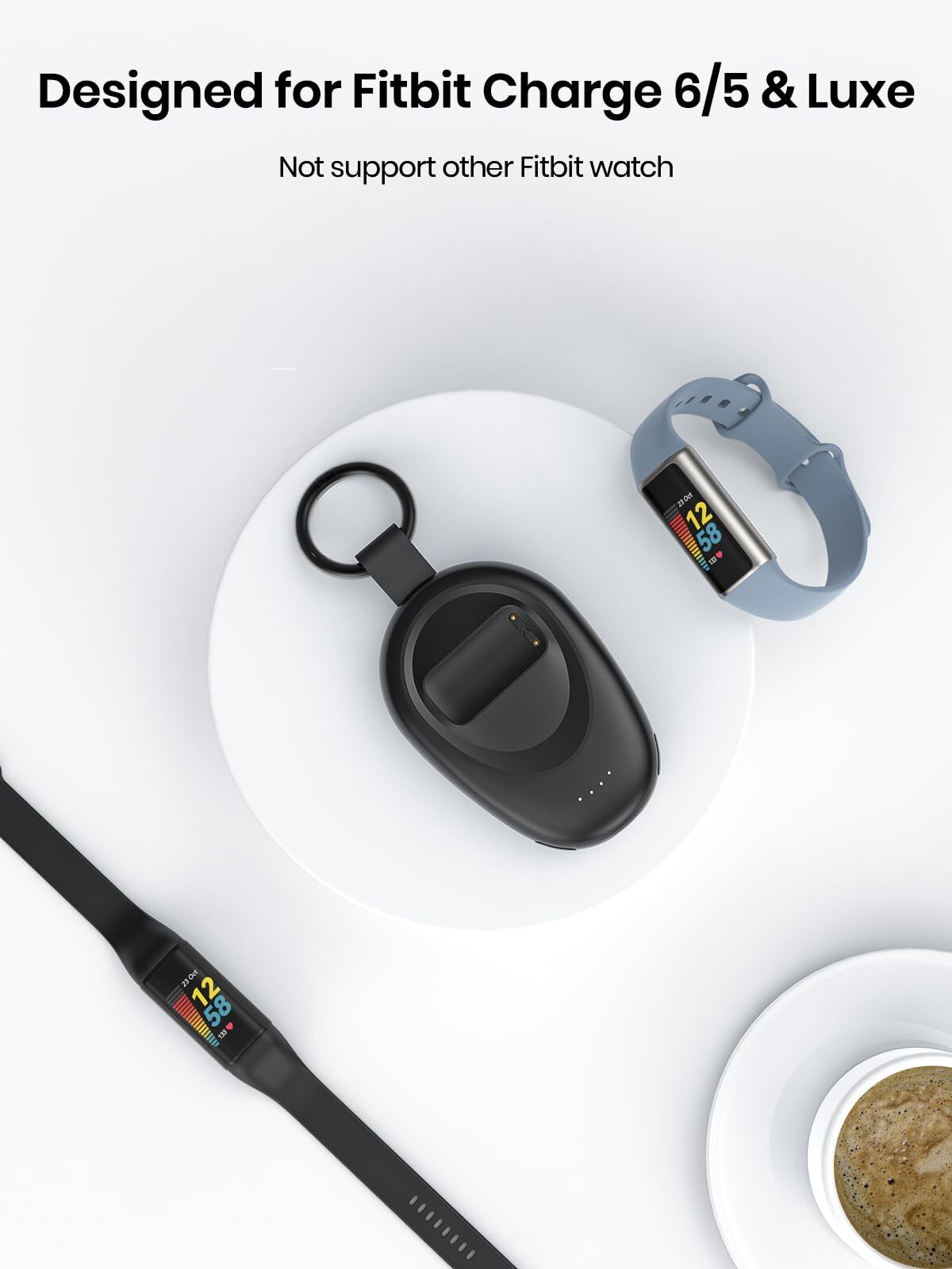 【Designed for Fitbit Charge 5 / Luxe】 This portable charger compatible with Fitbit Charge 6 / 5 / Luxe Watch. Say goodbye to low battery anxiety and keep your Fitbit Charge 5 / Luxe Watch charged on-the-go with this convenient and reliable charger. (Not support other Fitbit Watch) 【Portable Charger for Fitbit】 This portable charger for Fitbit equipped with a powerful 1400mAh battery that can provide up to 6-8 full charge for Fitbit Charge 6 / 5 / Luxe. This portable charger also features four LED indicators that make it easy to check the battery level at a glance (0--25%--50%--75%--100%). 【Fast Charging】 Our watch charger for Fitbit offers fast charging experience, you can fully charge your Fitbit with just 0.5 hours. And recharge the power bank in approximately 2 hours. Simply click the side button to start charging and double-click to stop. 【Magnetic Induction Charging】 This magnetic watch charger for Fitbit is equipped with a powerful magnetic adsorption module that ensures it stays firmly attached to the center of the charger, preventing any accidental sliding off. All you need to do is dock your watch onto the magnet and charging will commence immediately upon contact. 【Charge On the Go】 This watch charger for Fitbit boasts a compact and portable design, making it effortless to store and convenient to carry with you wherever you go. Additionally, the inclusion of a keyring allows for easy attachment to your bag or backpack. Perfect for using at home, office, business trips and travels. Package Include: 1* Portable Power Bank for Fitbit Charge 6 / 5 / Luxe; 1* USB-C to USB-A Charging Cable; 1* User Manual
