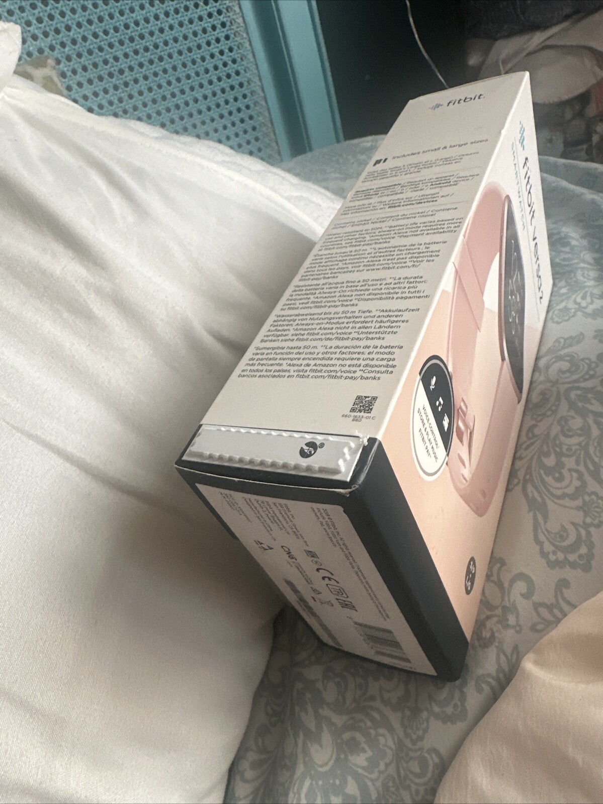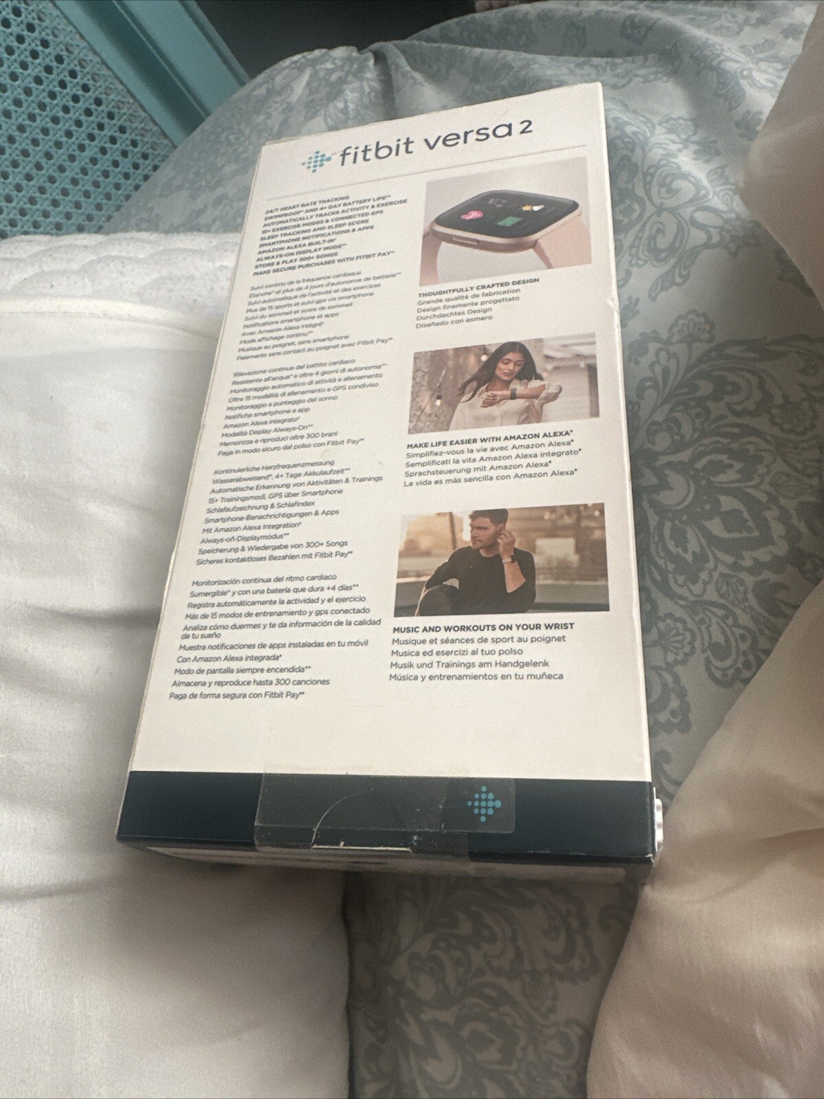 This is a Fitbit Versa 2 activity tracker in Petal/Copper Rose color. It has various features such as wireless connectivity, temperature and GPS tracking, among others. The device is water-resistant and has a rechargeable battery. It can be synced with both iOS and Android operating systems. The Fitbit Versa 2 is suitable for gym and training activities, walking, Crossfit, swimming, yoga, Pilates, running, and jogging. The activity tracker can monitor heart rate, calorie intake, distance, and sleep patterns. It also allows users to set goals and store memories.