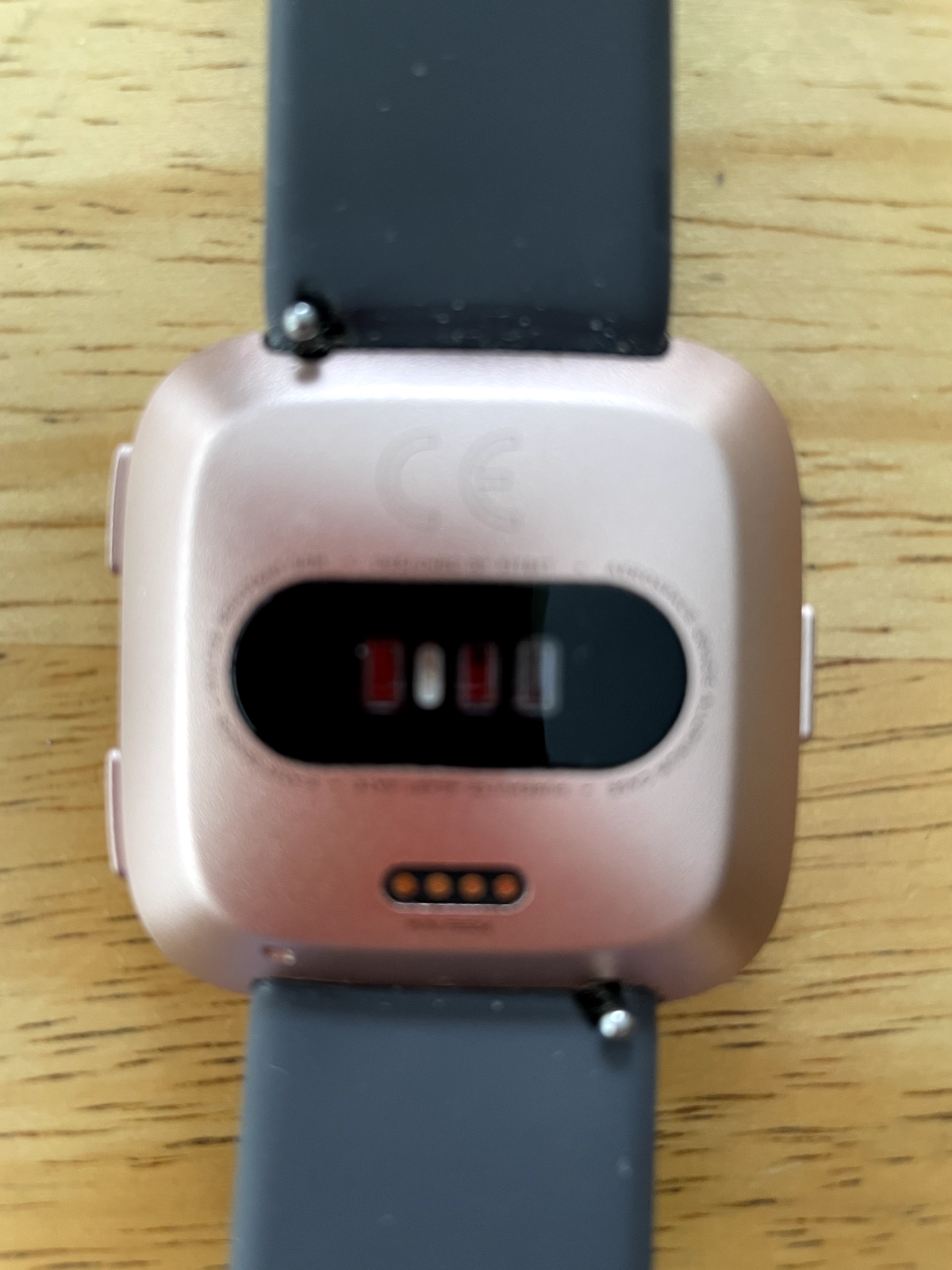 The Fitbit Versa Fitness Smartwatch in Rose Gold (Model FB504) is an activity tracker designed for various sports and activities. It features Bluetooth connectivity, a rechargeable battery, a clock, a calorie monitor, and an average heart rate monitor. Made of aluminum, it is compatible with iOS and Android operating systems. This version includes a large band and does not come with a charger. Perfect for gym training, crossfit, swimming, pilates, running, and fitness activities. Condition Used: An item that has been used previously. The item may have some signs of cosmetic wear, but is ... Read more about the condition Display Resolution 300 x 300 Power Source Electric Cordless Indoor/Outdoor Indoor/Outdoor Material Aluminum, Silicone Type Activity Tracker Department Unisex Adults Battery Life Up to 4 Days Measurement Provided Calories, Heart Rate, Time Display Size 1.3 Inches Language English Model Fitbit Versa Body Area Wrist Sensors Accelerometer, Ambient Light, Heart Rate Monitor UPC 0723548599835 Brand Fitbit Size L Color Rose Gold MPN FB504 Features Bluetooth, Average Speed, Alarm, Altimeter, Calorie Monitor, Average Heart Rate For Operating Systems iOS Sport/Activity Gym & Training, Crossfit, Swimming, Pilates, Running & Jogging, Fitness