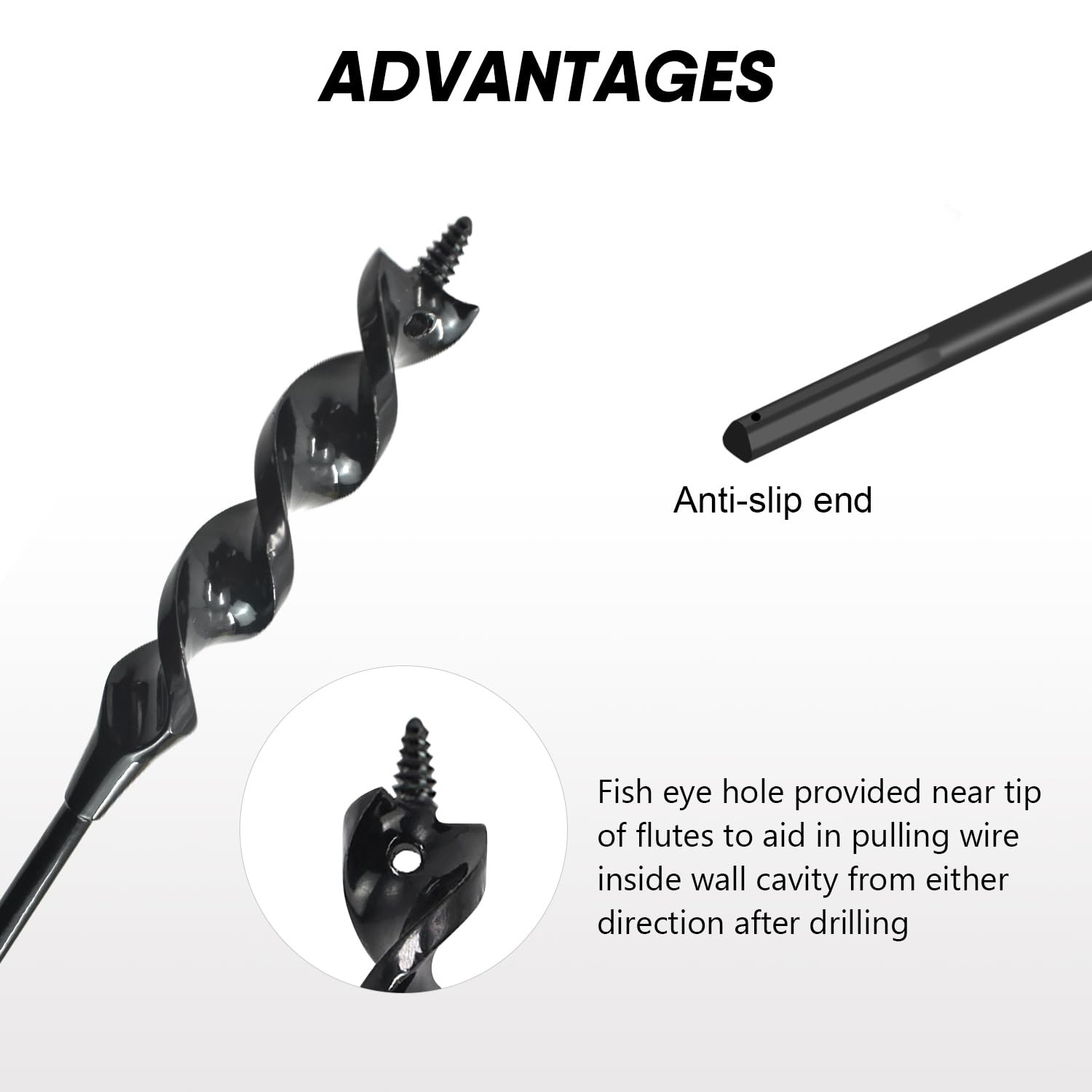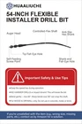 package: 3/4*54 inch fish bit The drill bit has flexible combination screw point installer bit. The ultra sharp threads provide better pulling power and faster drilling speeds. It moves quickly through obstructions. This drill bit is recommended for use when drilling through wood walls or drywall. self feeding screw point. Three flat non-slip grip on the chuck end. Flexible shank. Wire fishing accommodation holes Attention: 1:the head of the bit maybe broke off when it got stuck in the hole with the accumulated wood shavings 2:If you overpower most drill bits, they will break. In order to not break it, when you feel it not wanting to turn, back it out and try again. That’s what we suggest and it worked perfectly 3:the function of the drill ball:Worked great in combination with a drill bit ball on it to help keep the tip from drilling too close to the edge while inside the wall 4:drill it carefully going forward and backward to avoid the drill bit getting stuck in joist, if it snags or sticks, back it out and try again. Do not force the bit Safety Information Always wear approved eye protection.Never use on or near live electrical circuits. Note : Read and follow safety instructions in power tool owner's manual. 5:Wood Applications the sharp threads give this bit the best pulling power available. to moves quickly through some of the hard wood, the nail will damage the bit and get dull or even broke when hit the nail [Professional-Grade Durability]:Use this flexible installer drill bit for walls and ceilings,with minimal damage.Made from high-carbon spring steel, this flexible drill bit for wire pulling resists bending fatigue and corrosion, ensuring long-term reliability for electricians, installers, and DIYers tackling heavy-duty wiring tasks. [Anti-slip end]:the fish bit was designed with a 3 flat tip shank to prevent slipping in chuck.Unlike generic flex bits, our anti-slip shank + reinforced eyelet prevents sudden dislodging during overhead drilling, reducing injury risks in cramped attic or basement spaces [Pulling Cable]: Fish eye hole provided near tip of flutes to aid in pulling wire inside wall cavity from either direction after drilling, without damage to the wall [Dimension]:3/4-inch head diameter, 1/4 inch shank diameter, and overall length is 54-inch [Flexibility]:54" Models: ▶ Max bend: 90° (Emergency brief use). ▶ Optimal Bend ≤60°, rotate steadily. [Rapid Installation, Zero Hassle]:Combine the flex drill bit with any 1/4" chuck drill for lightning-fast penetration through drywall, wood, and PVC.The long flexible drill bit for electrical wiring dramatically reduces installation time compared to traditional rigid bits, streamlining workflow for efficiency. [Universal Chuck Compatibility]:The 1/4" shank fits seamlessly into all cordless/corded drills, and the flexible auger drill bit for wire pulling maintains smooth, stable rotation under high-torque conditions—ensuring compatibility with professional-grade tools without wobbling or slippage. 【Tips】 1.Use a low speed and a powerful corded drill. Control the torque to prevent overheating, jamming, or damage. 2.For a sharper edge, new bits can be ground to remove the coating. Sharpen them regularly as they dull with use to extend their life.