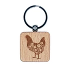 Floral Chicken Engraved Wood Square Keychain Tag Charm